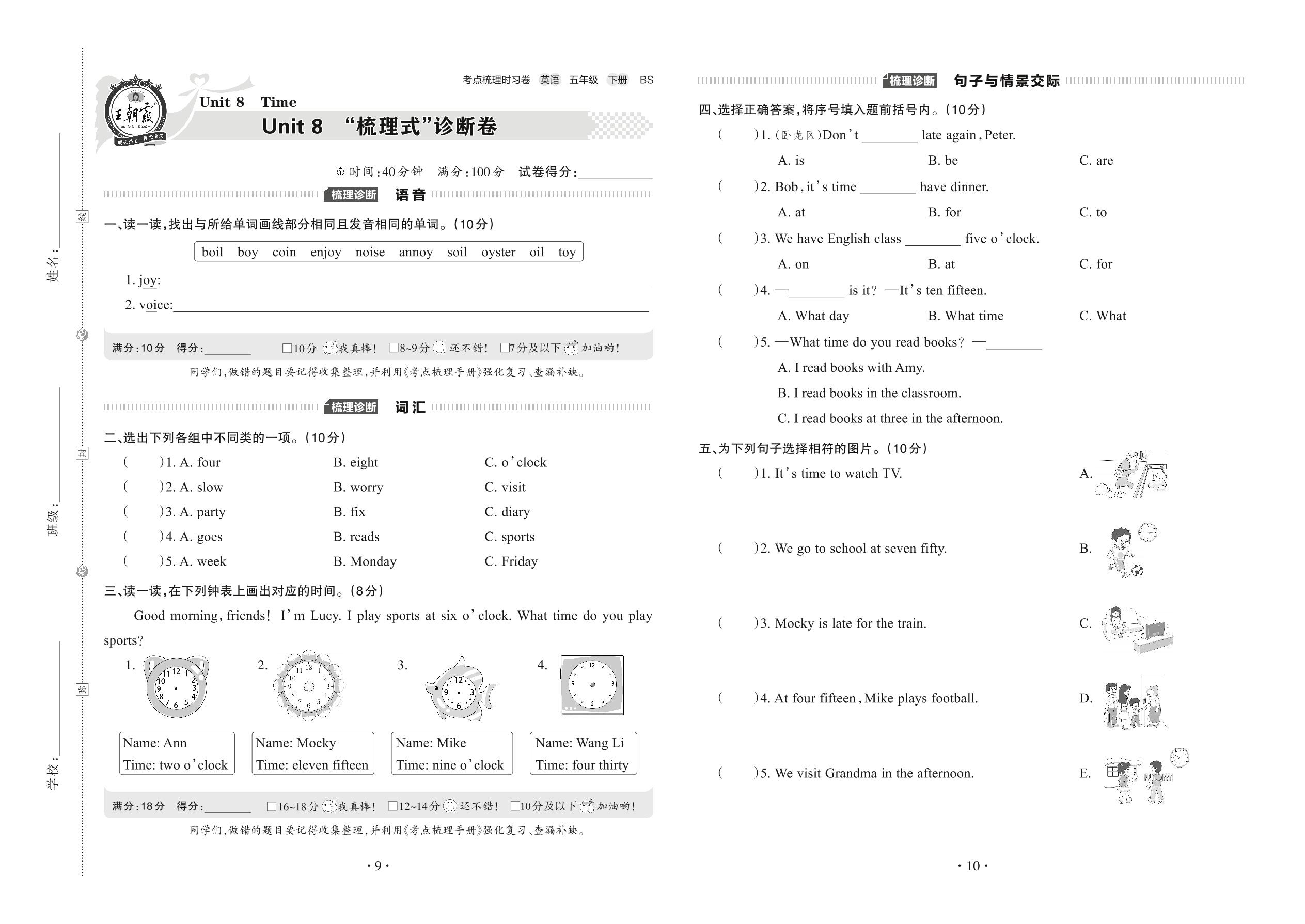 2022下册五年级英语北师版 Unit 8 “梳理式”诊断卷