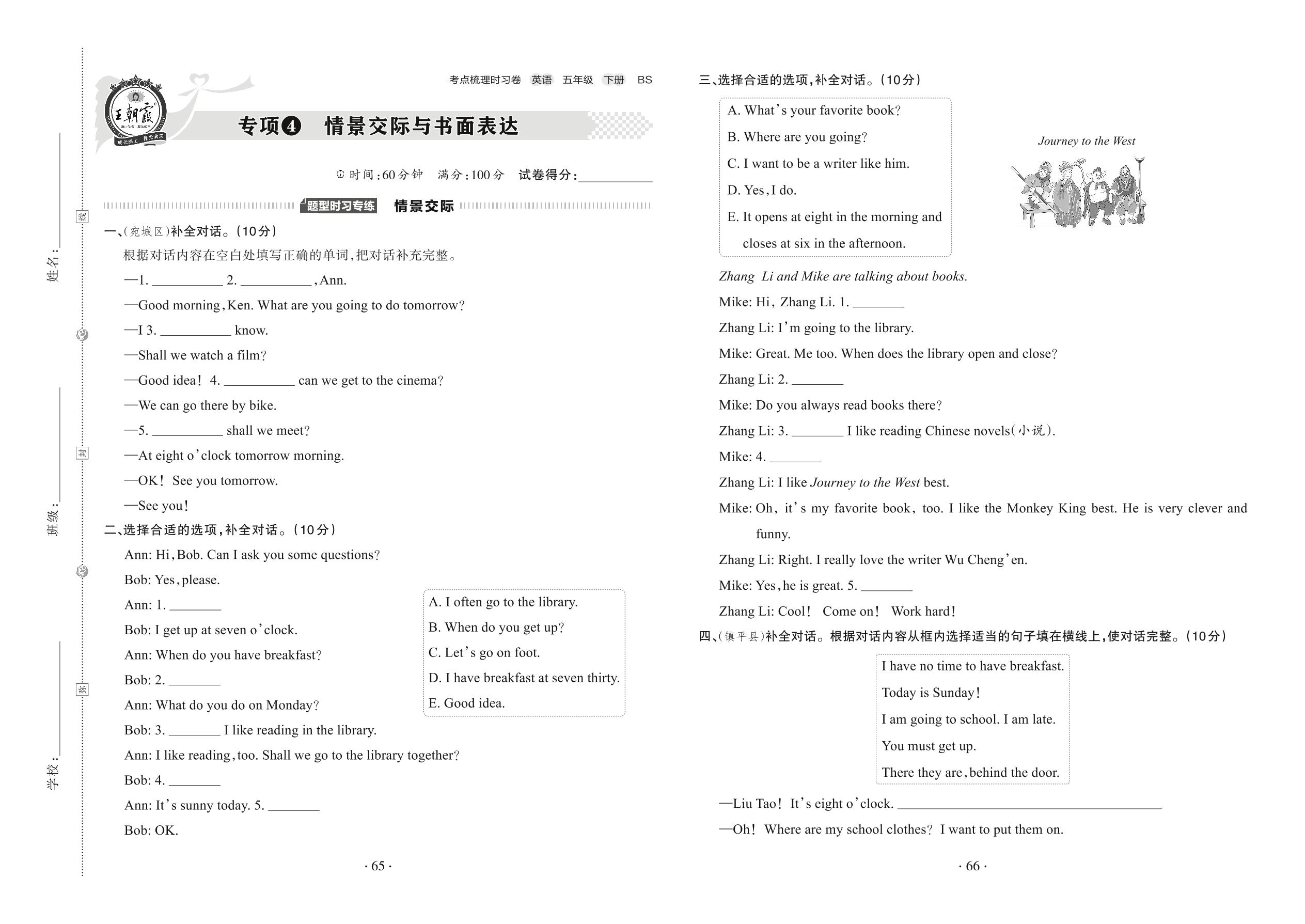 2022下册五年级英语北师版 专项4 情景交际与书面表达