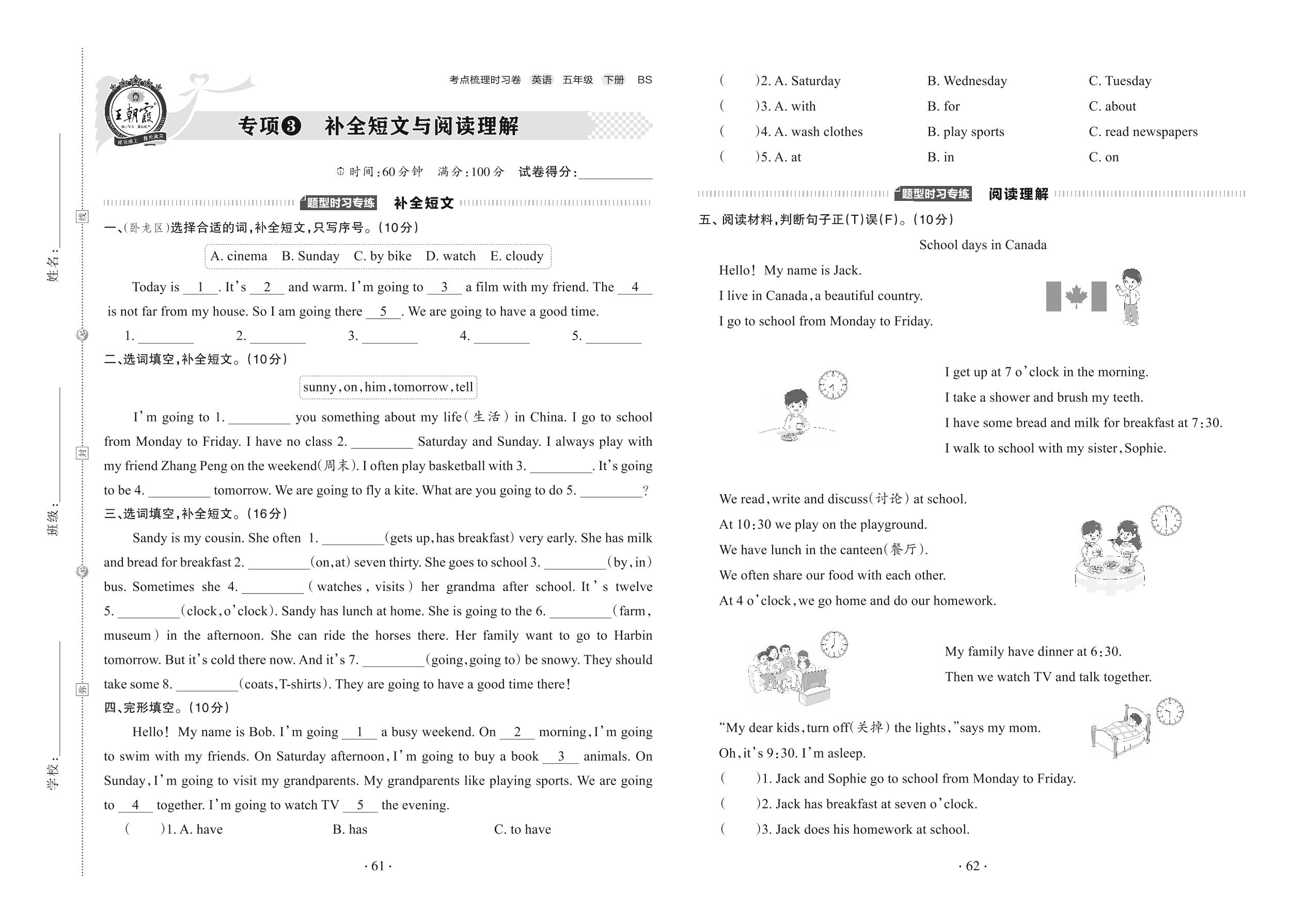 2022下册五年级英语北师版 专项3 补全短文与阅读理解