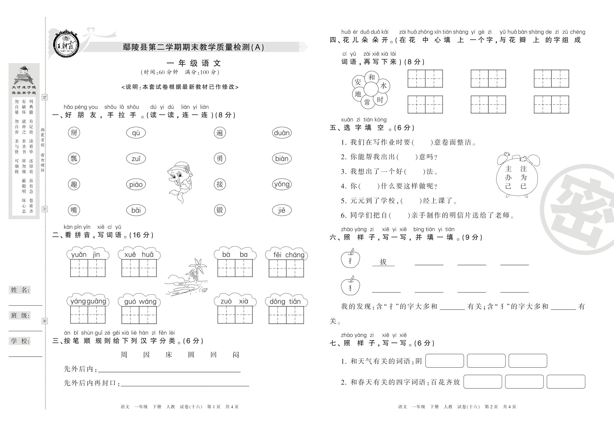 2015-2016学年第二学期许昌市鄢陵县一年级语文试卷(人教版)【16】