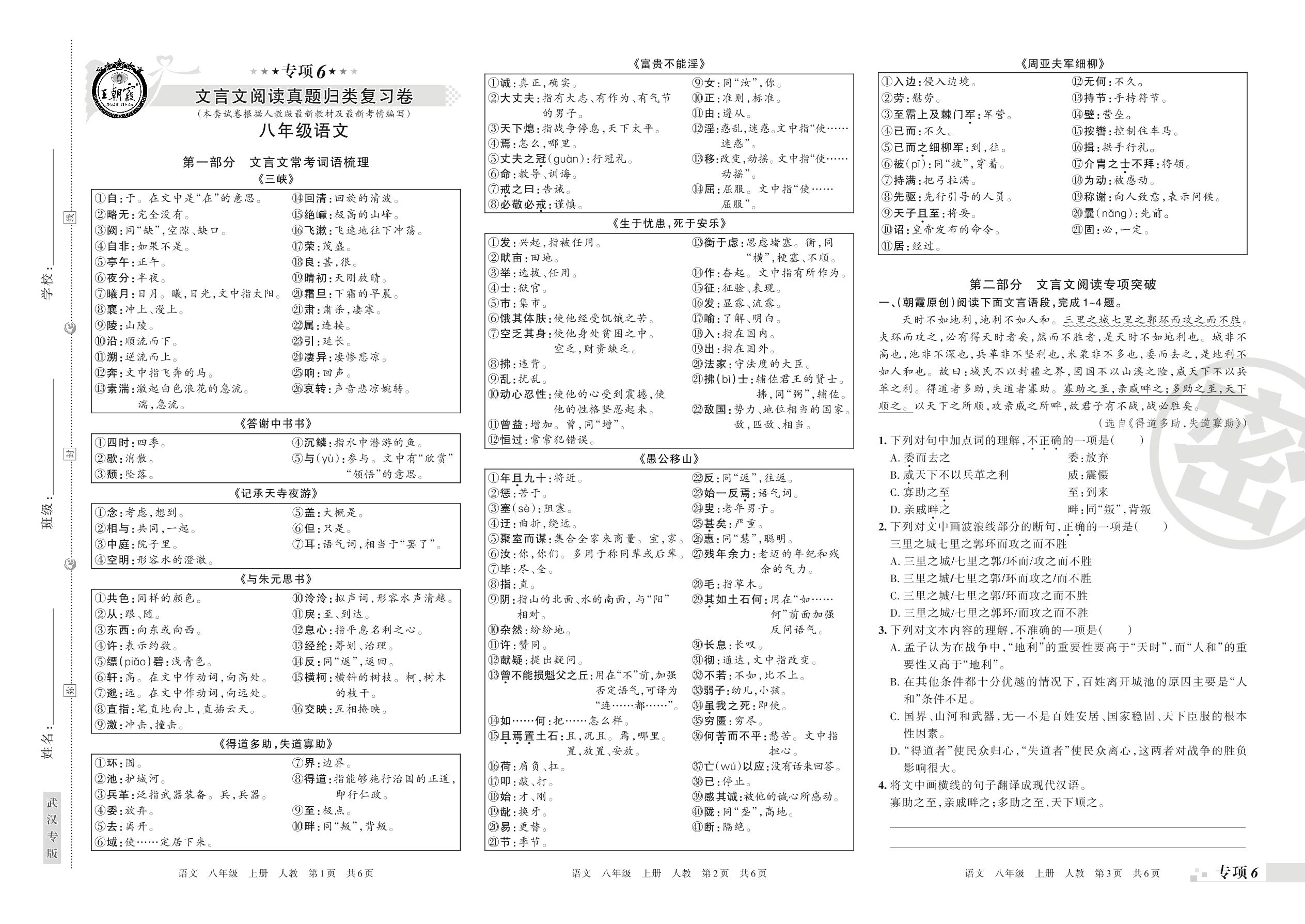 王朝霞期末专项卷——文言文阅读真题归类复习八年级上册语文(人教版)【0】
