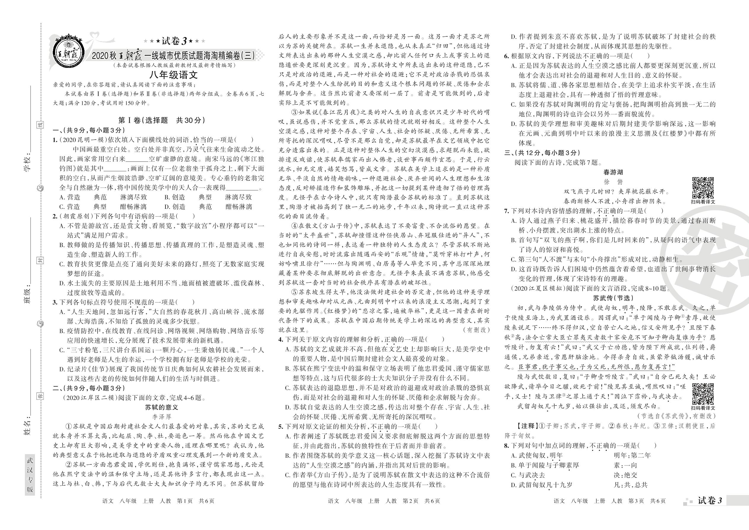 王朝霞海淘期末精编卷八年级上册语文(人教版)【3】