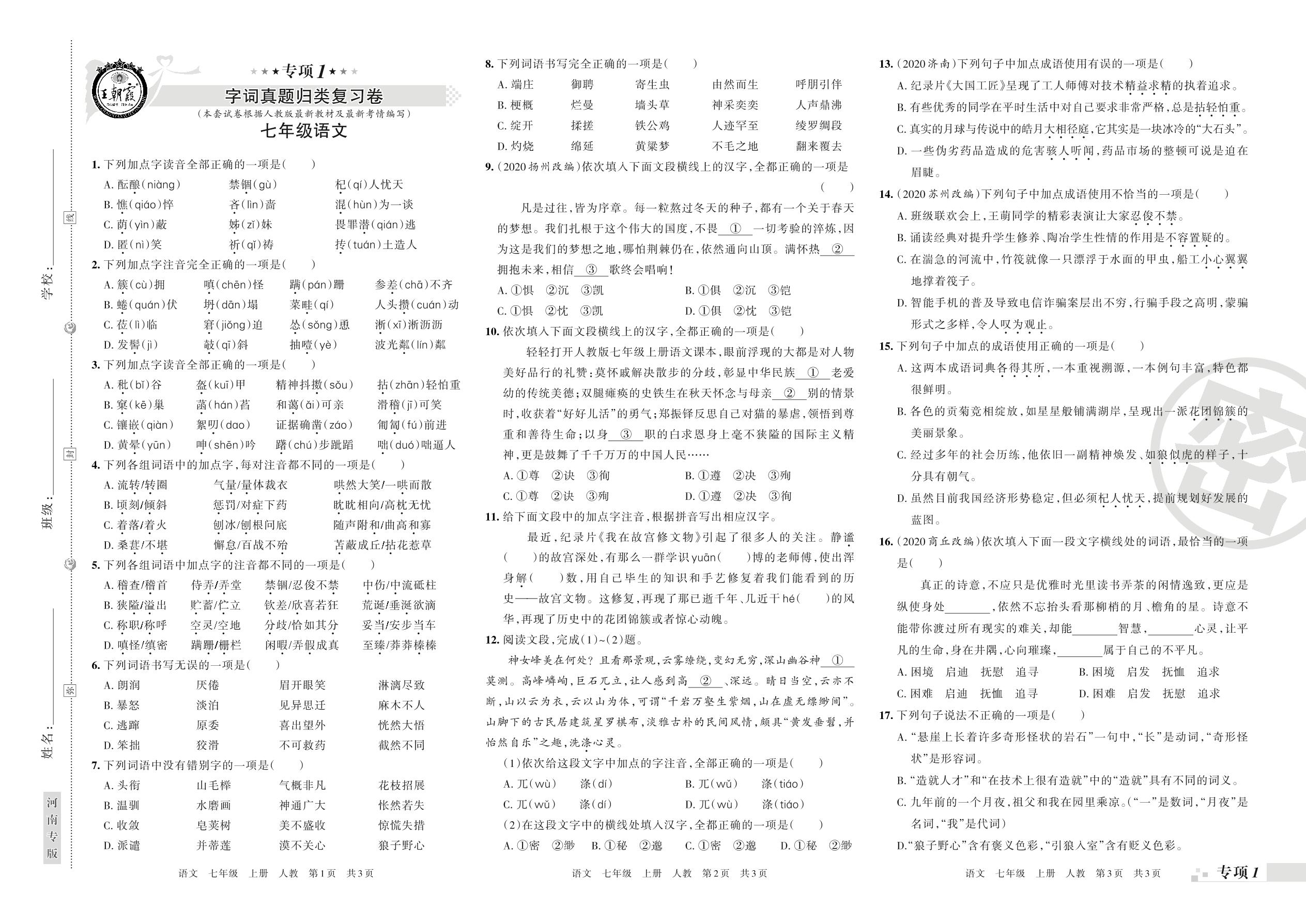 王朝霞期末专项卷——字词、句子真题归类复习七年级上册语文(人教版)【0】