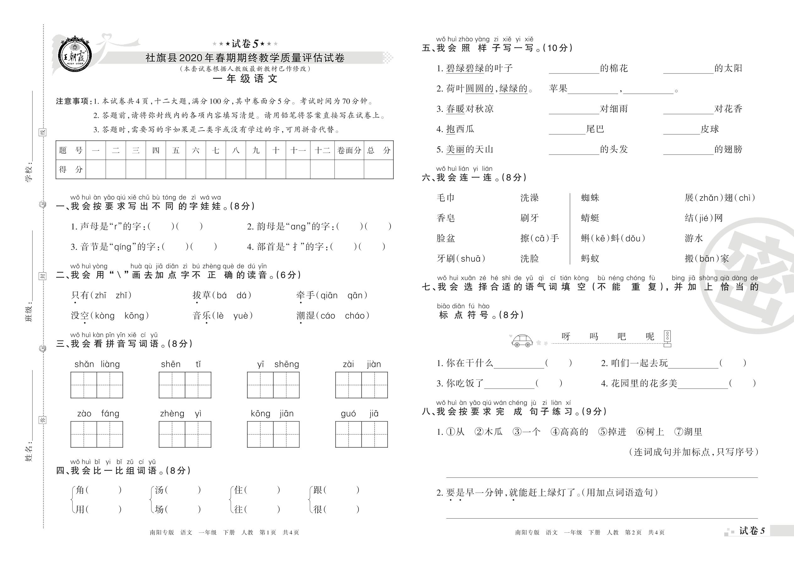 2019-2020学年第二学期南阳市社旗县一年级语文试卷(人教版)【5】