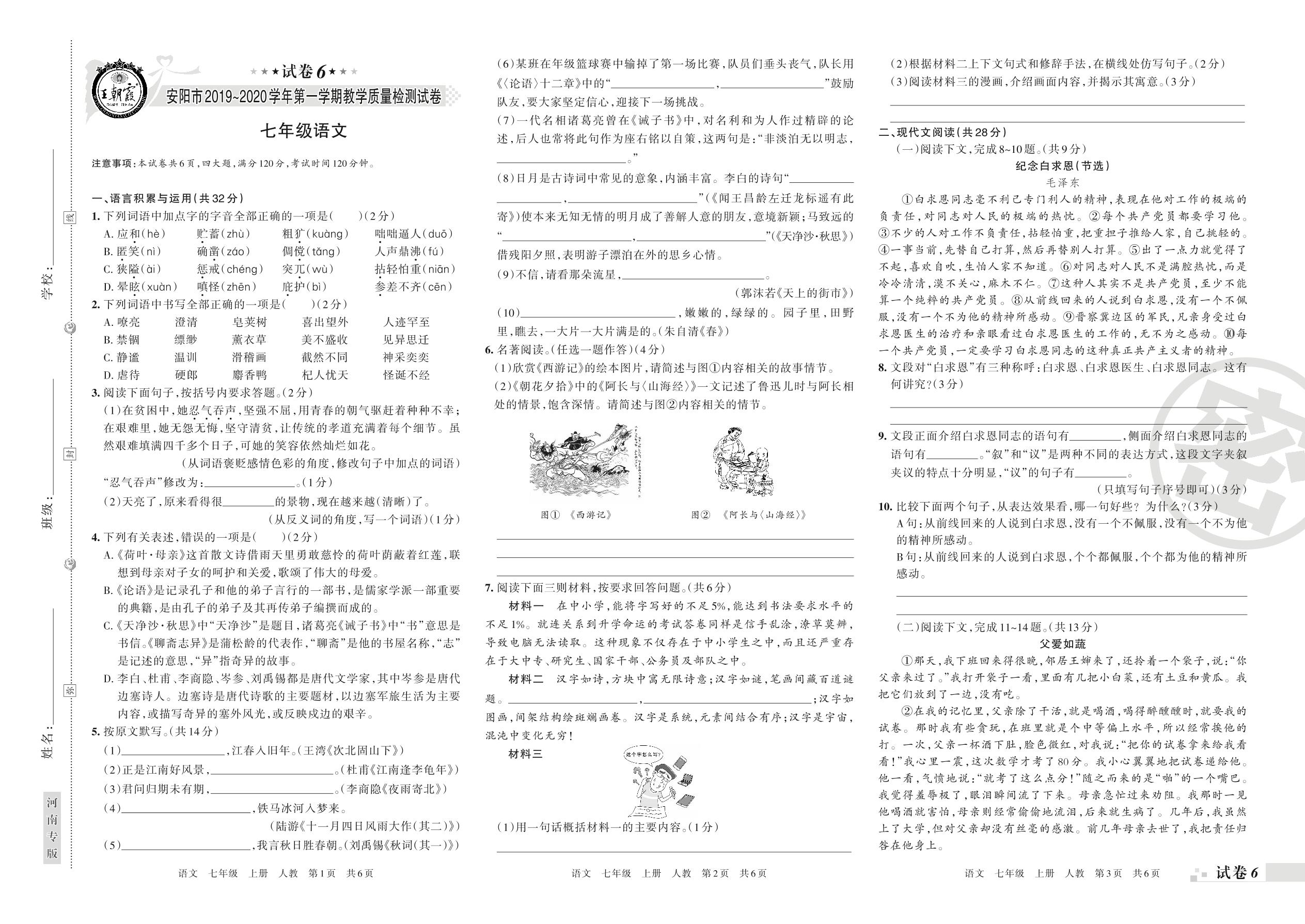 2019-2020学年第一学期安阳市七年级语文试卷(人教版)【6】