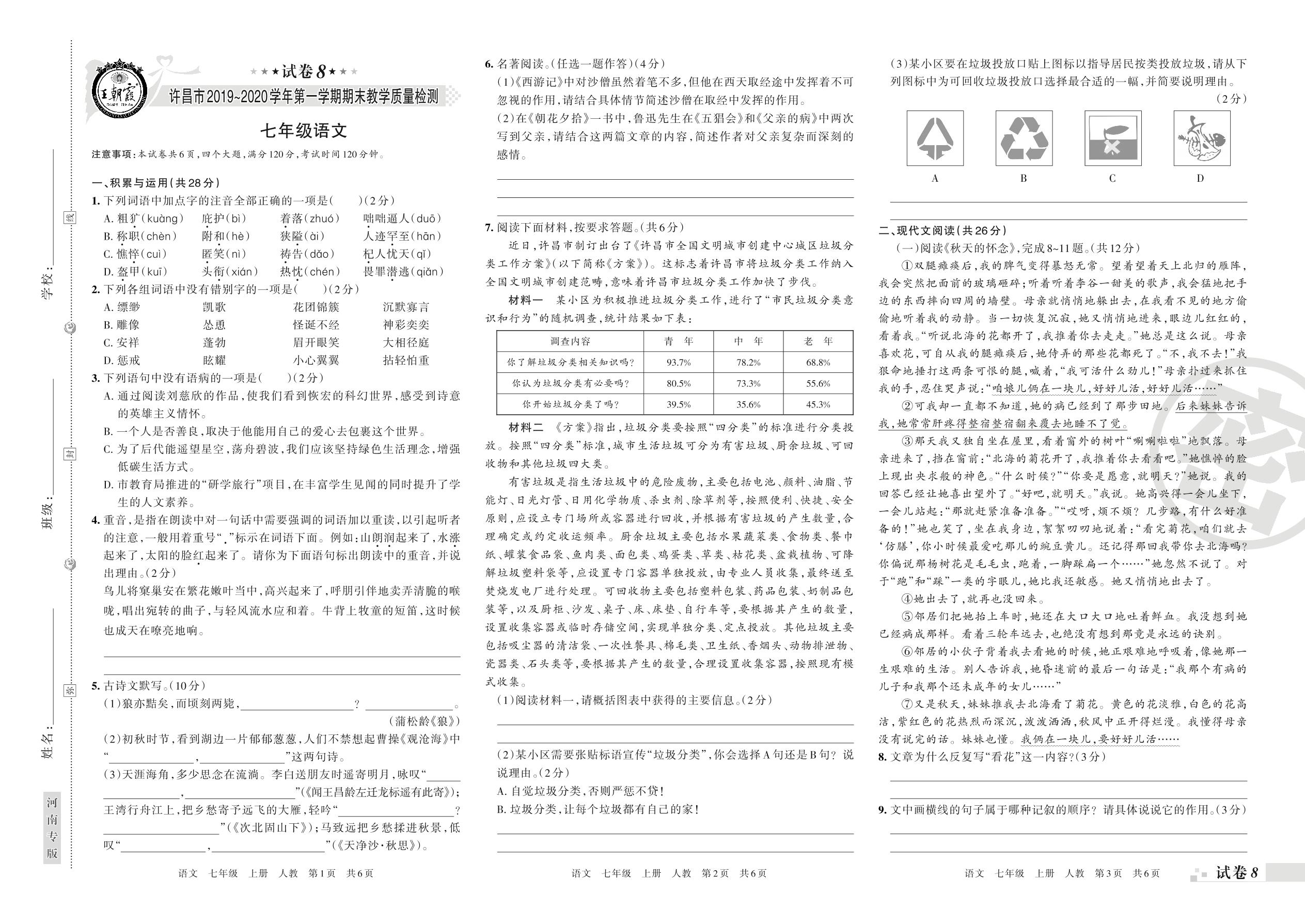 2019-2020学年第一学期许昌市七年级语文试卷(人教版)【8】