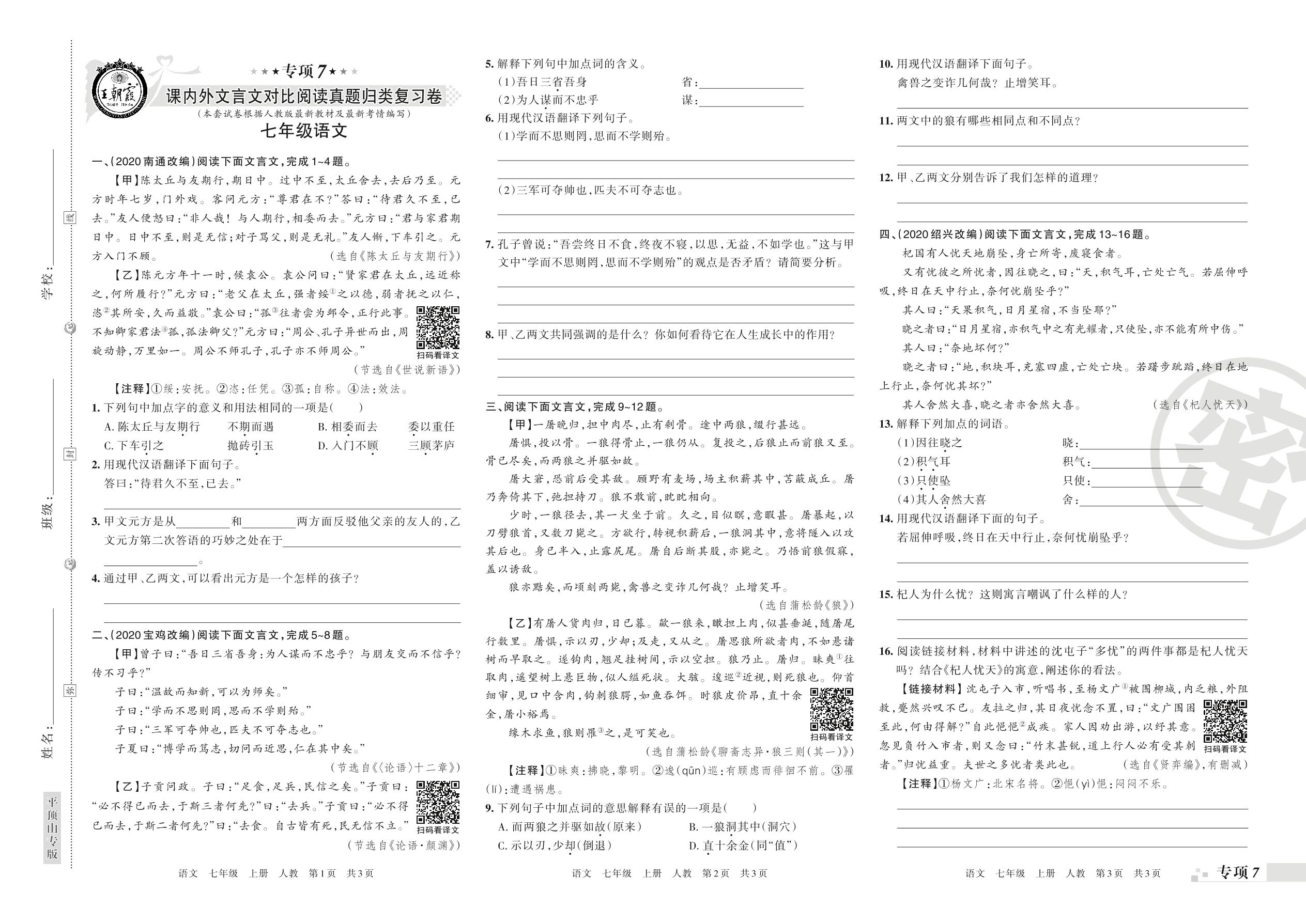 王朝霞期末专项卷——课内外文言文对比阅读、古诗词阅读真题归类复习七年级上册语文(人教版)_R2108025131【0】