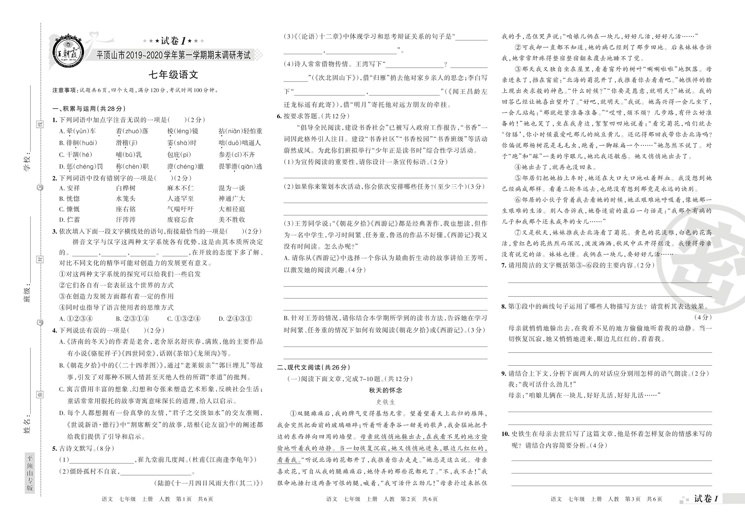 2019-2020学年第一学期平顶山市七年级语文试卷(人教版)【1】
