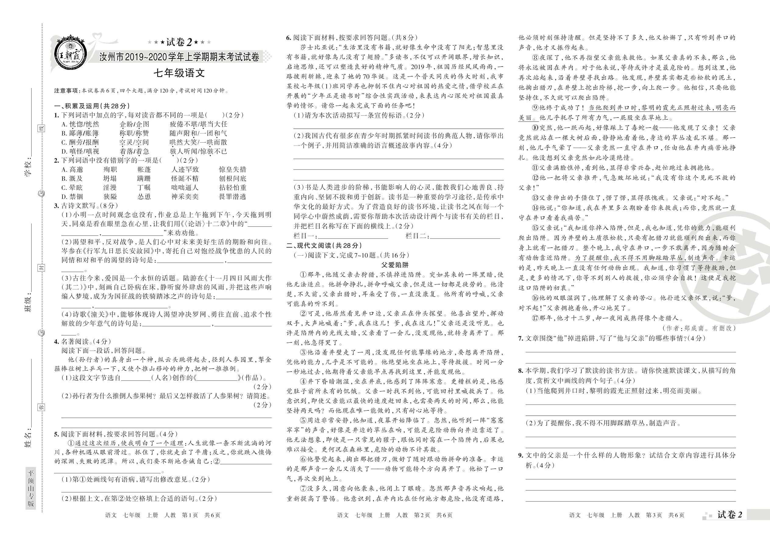 2019-2020学年第一学期汝州市七年级语文试卷(人教版)【2】