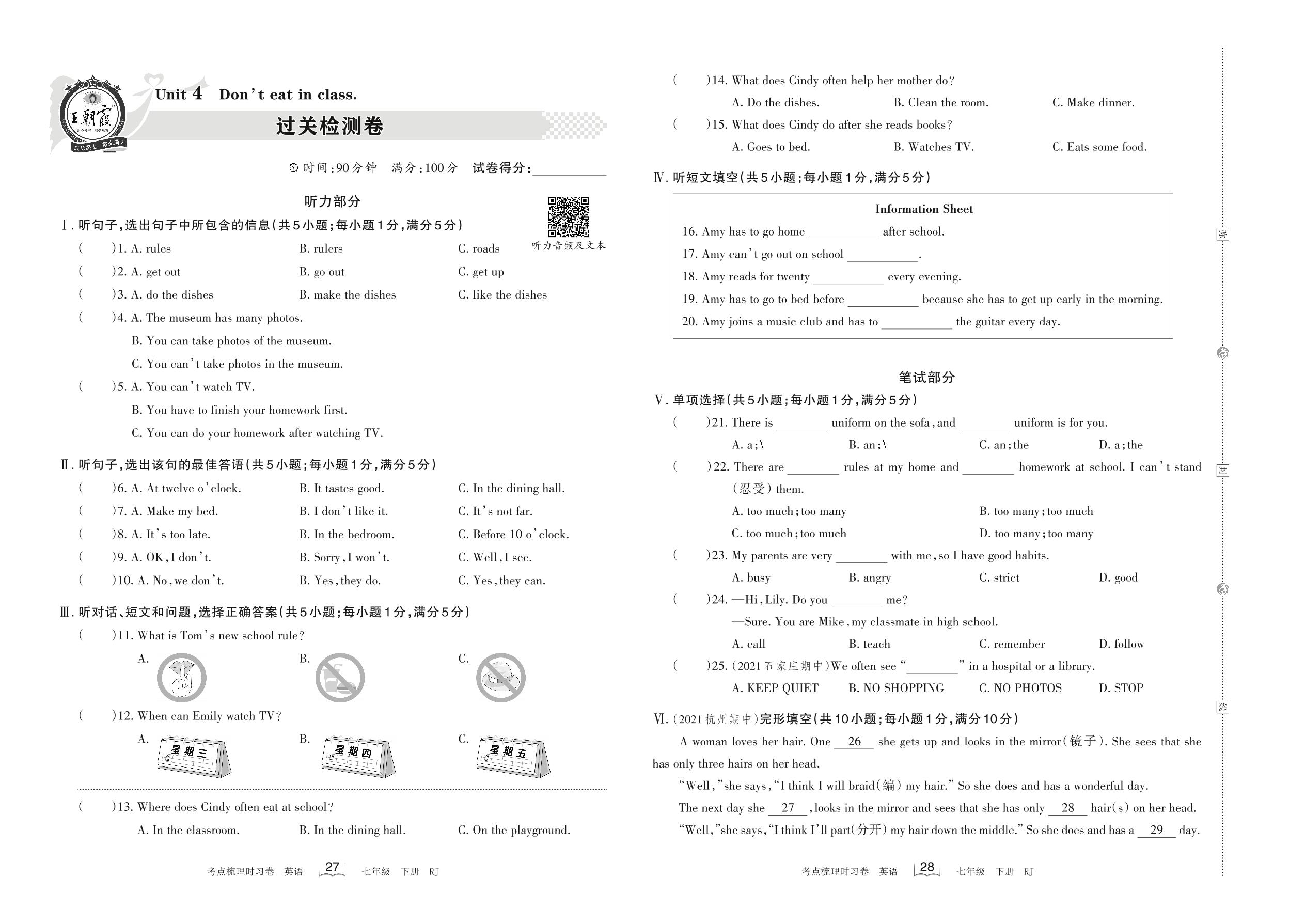 2022下册七年级英语人教版 Unit 4 过关检测卷_R220222105259652