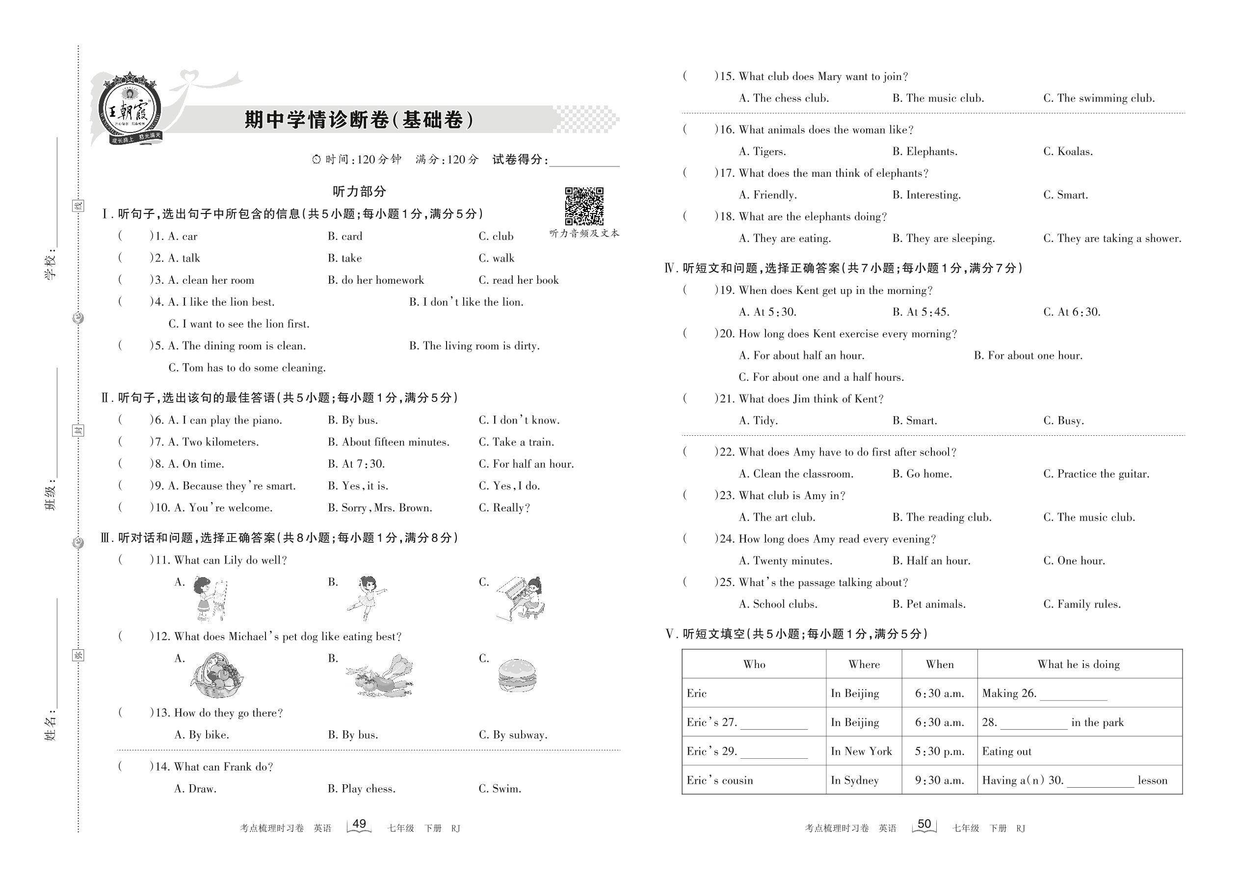 七年级英语人教版下册期中卷
