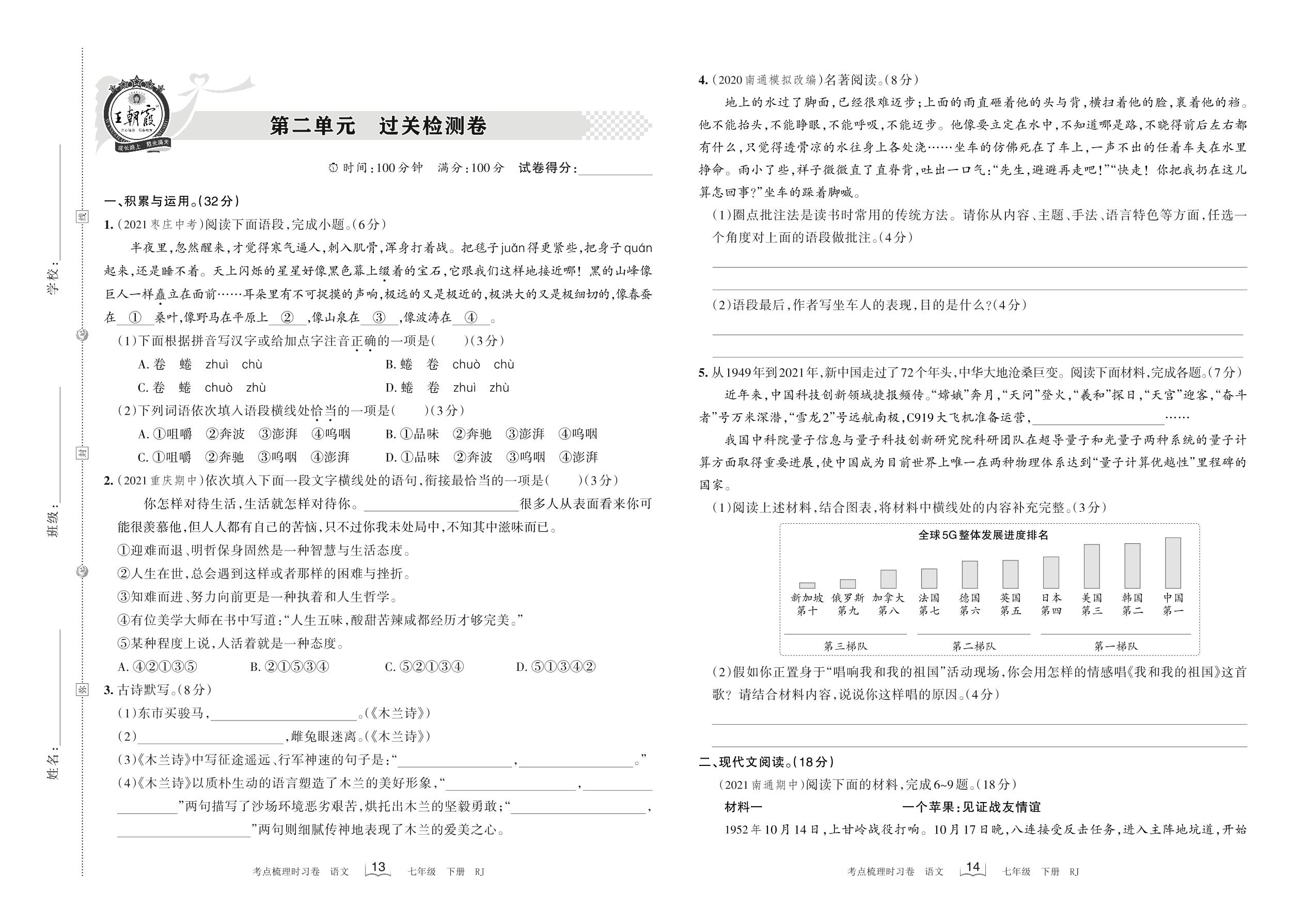 2022下册七年级语文人教版 第二单元 过关检测卷