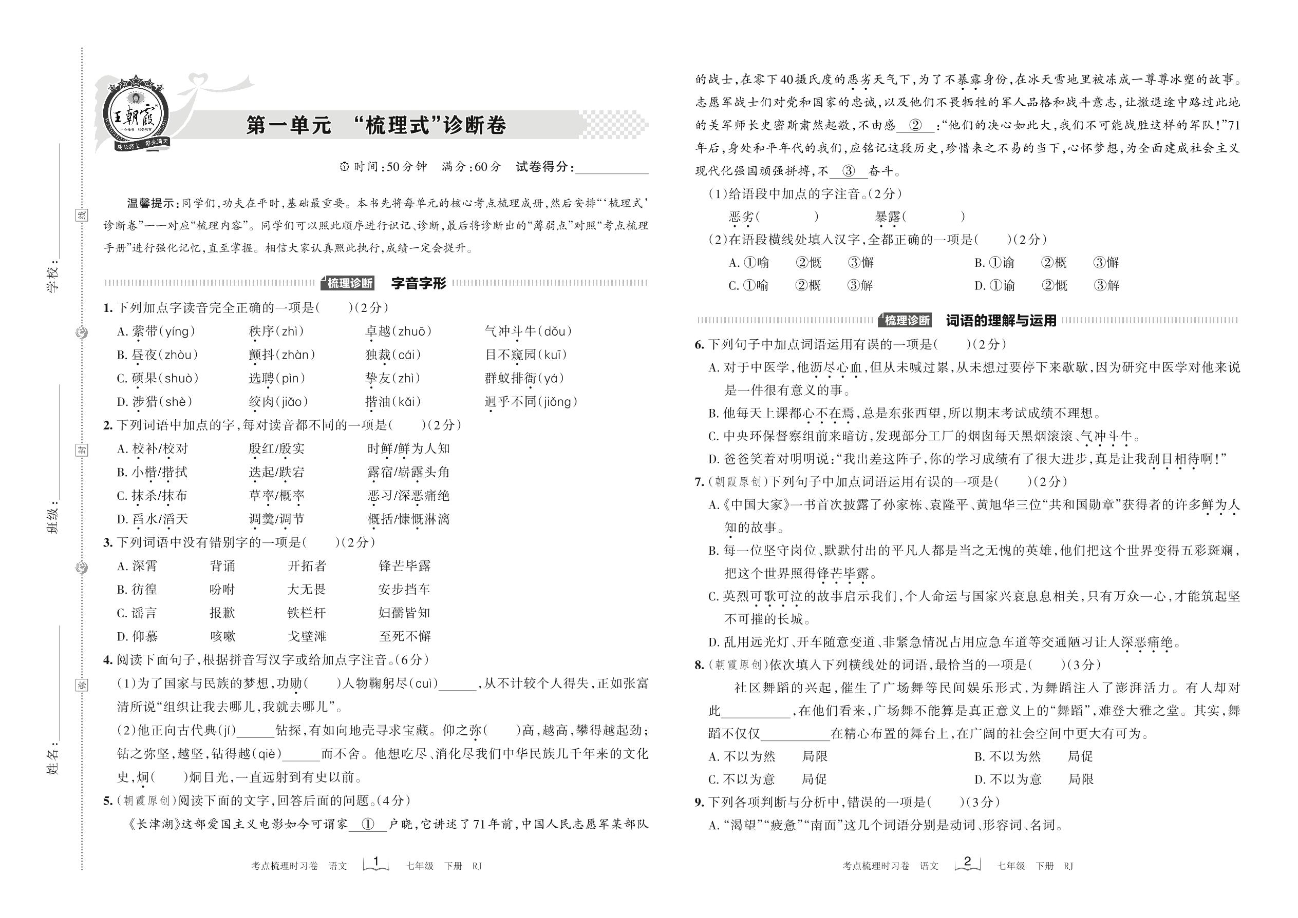 2022下册七年级语文人教版 第一单元 “梳理式”诊断卷