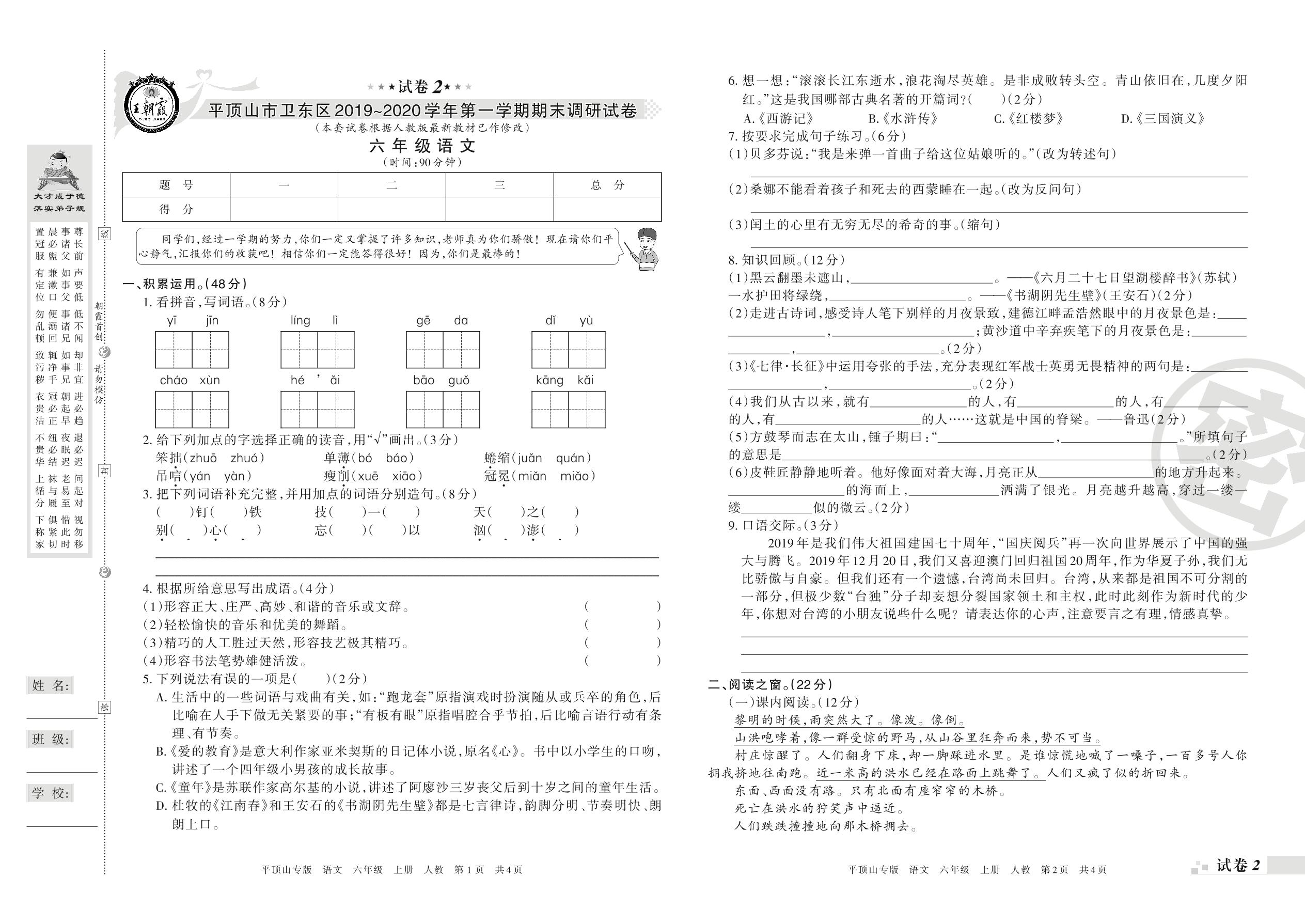 2019-2020学年第一学期平顶山市卫东区六年级语文试卷(人教版)【2】