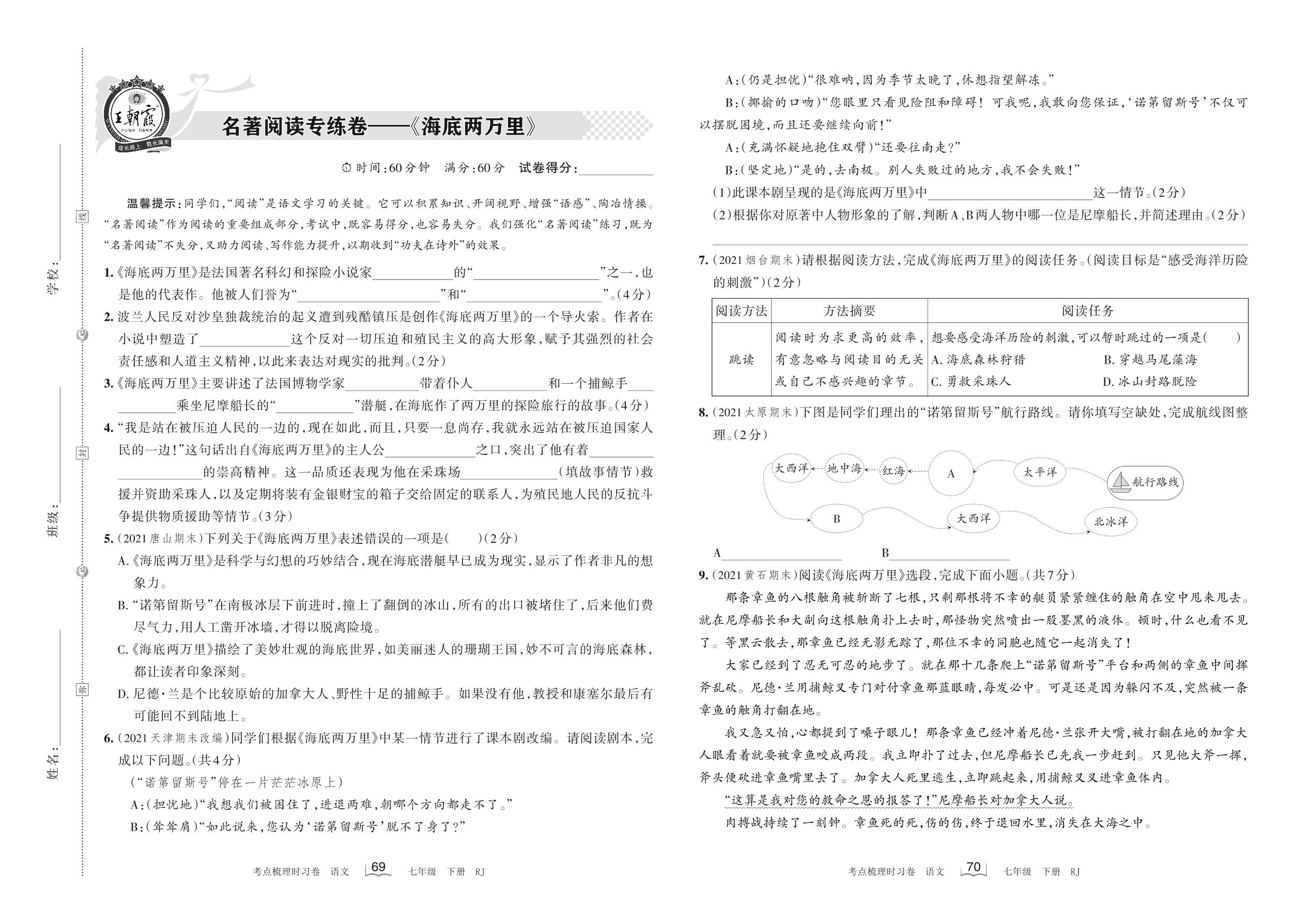 2022下册七年级语文人教版 名著阅读专练卷——《海底两万里》