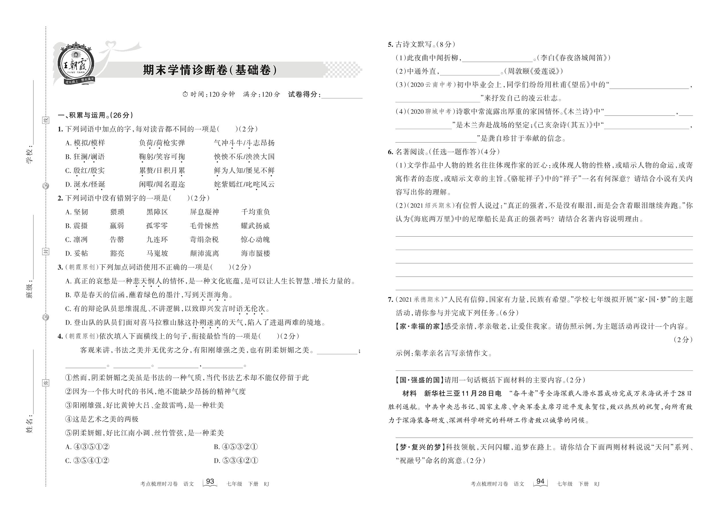 2022下册七年级语文人教版 期末学情诊断卷(基础卷)