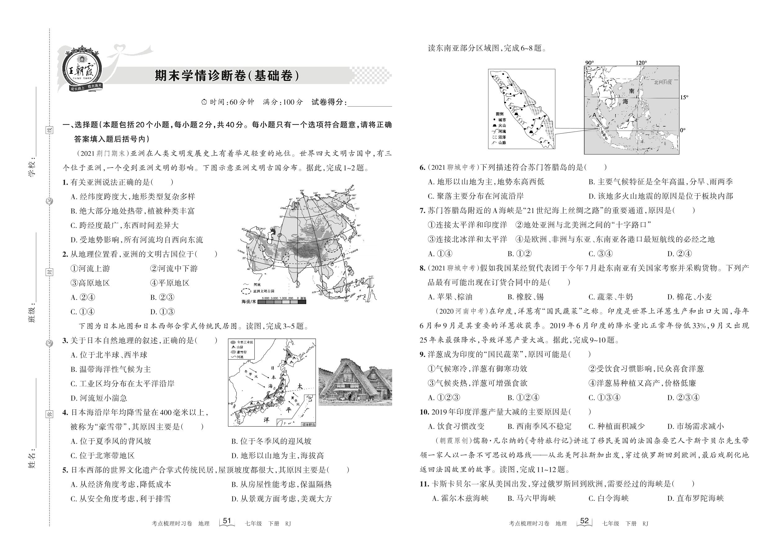 2022下册七年级地理人教版 期末学情诊断卷(基础卷)
