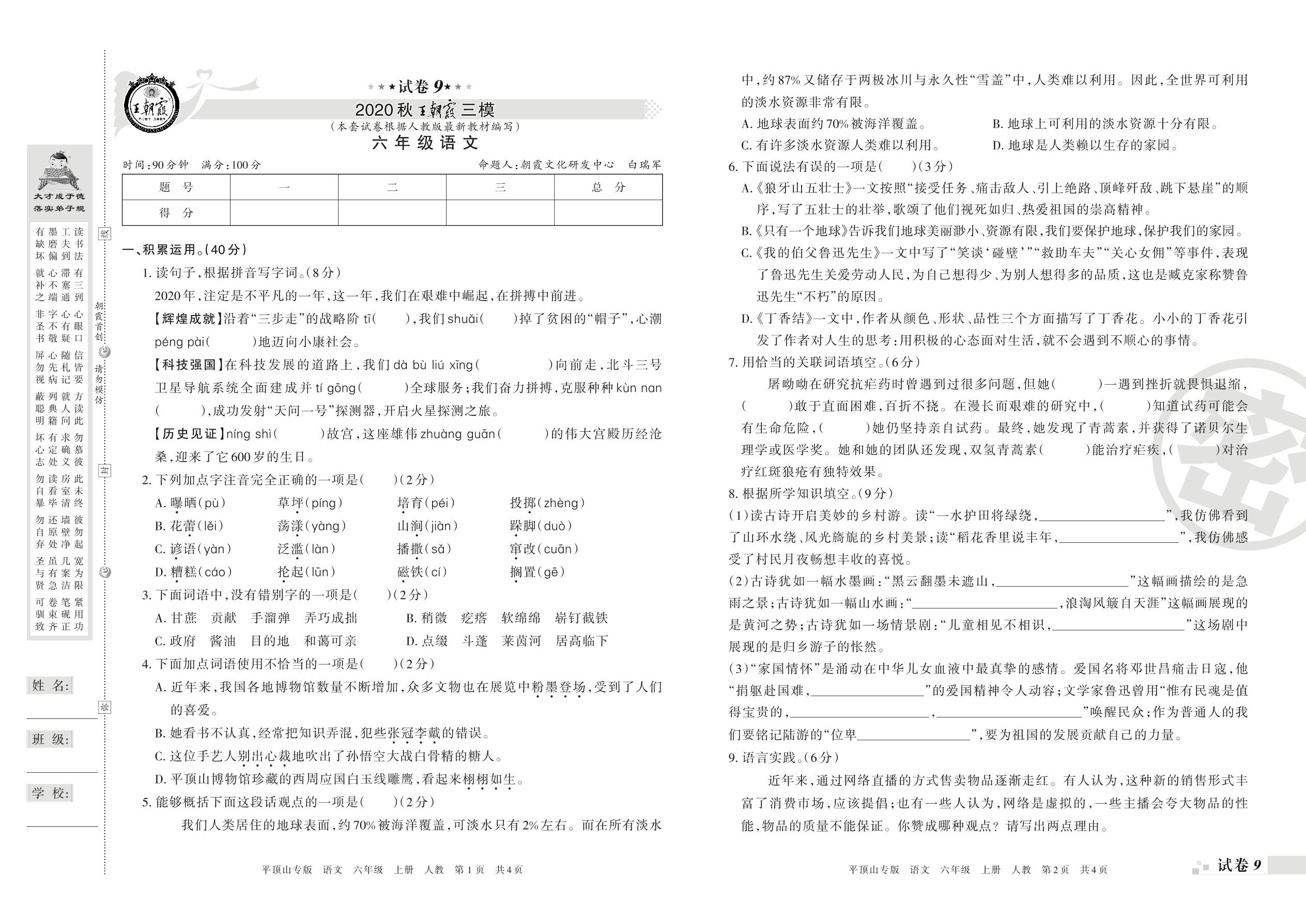 王朝霞期末模拟卷六年级上册语文(人教版)_R2108025348【9】