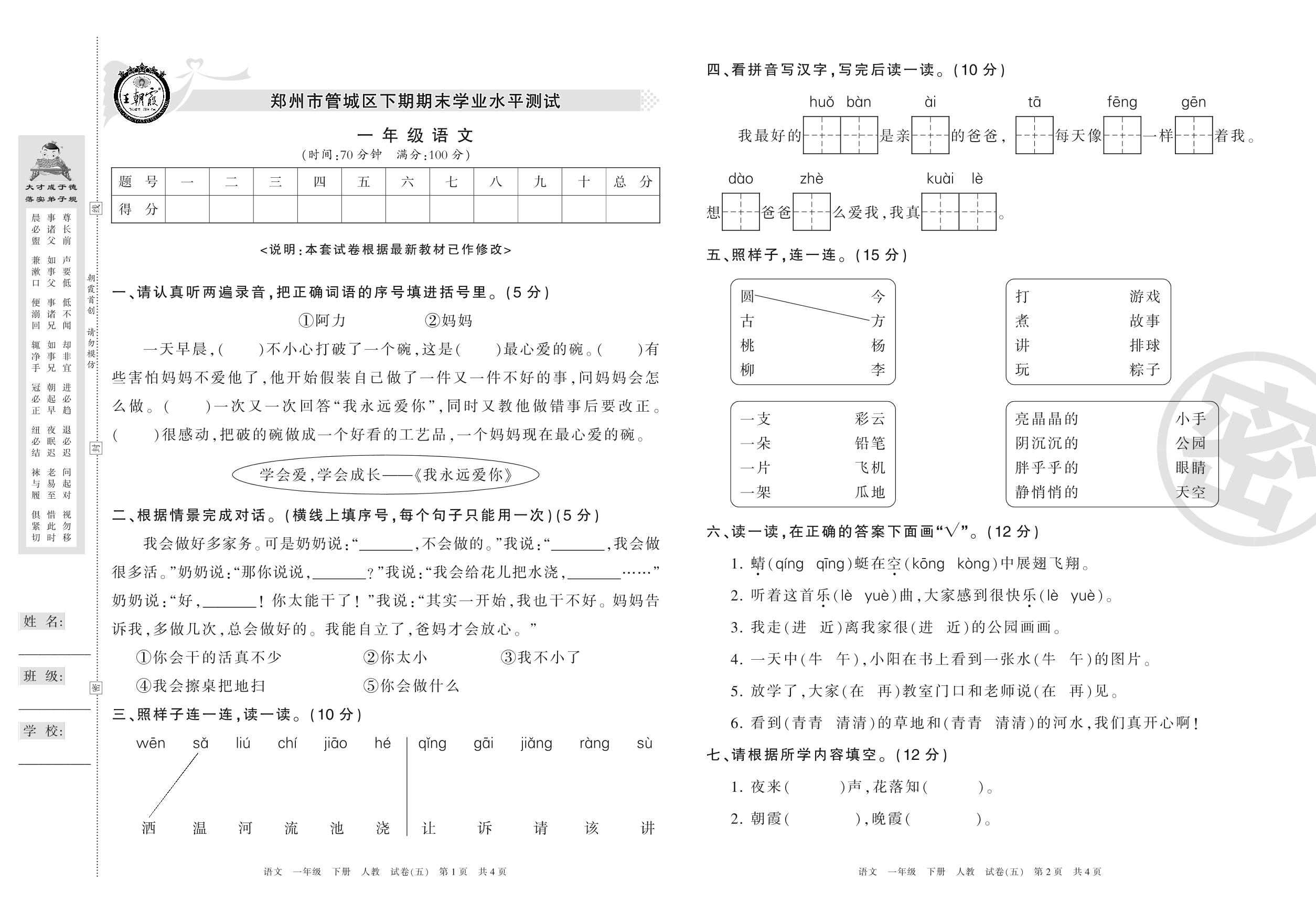 2015-2016学年第二学期郑州市管城区一年级语文试卷(人教版)【5】
