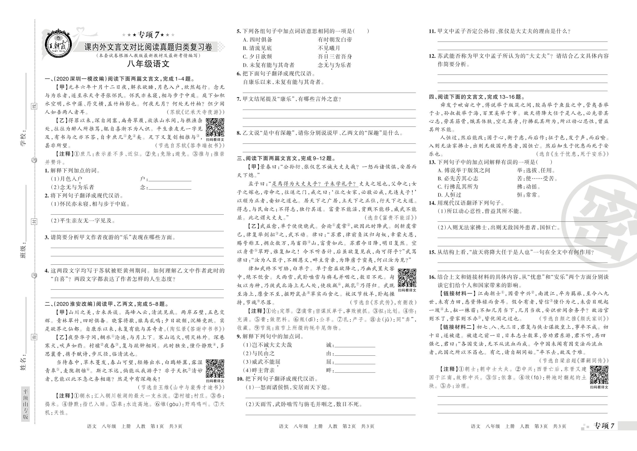 王朝霞期末专项卷——课内外文言文对比阅读、古诗词阅读真题归类复习八年级上册语文(人教版)_R2108025424【0】