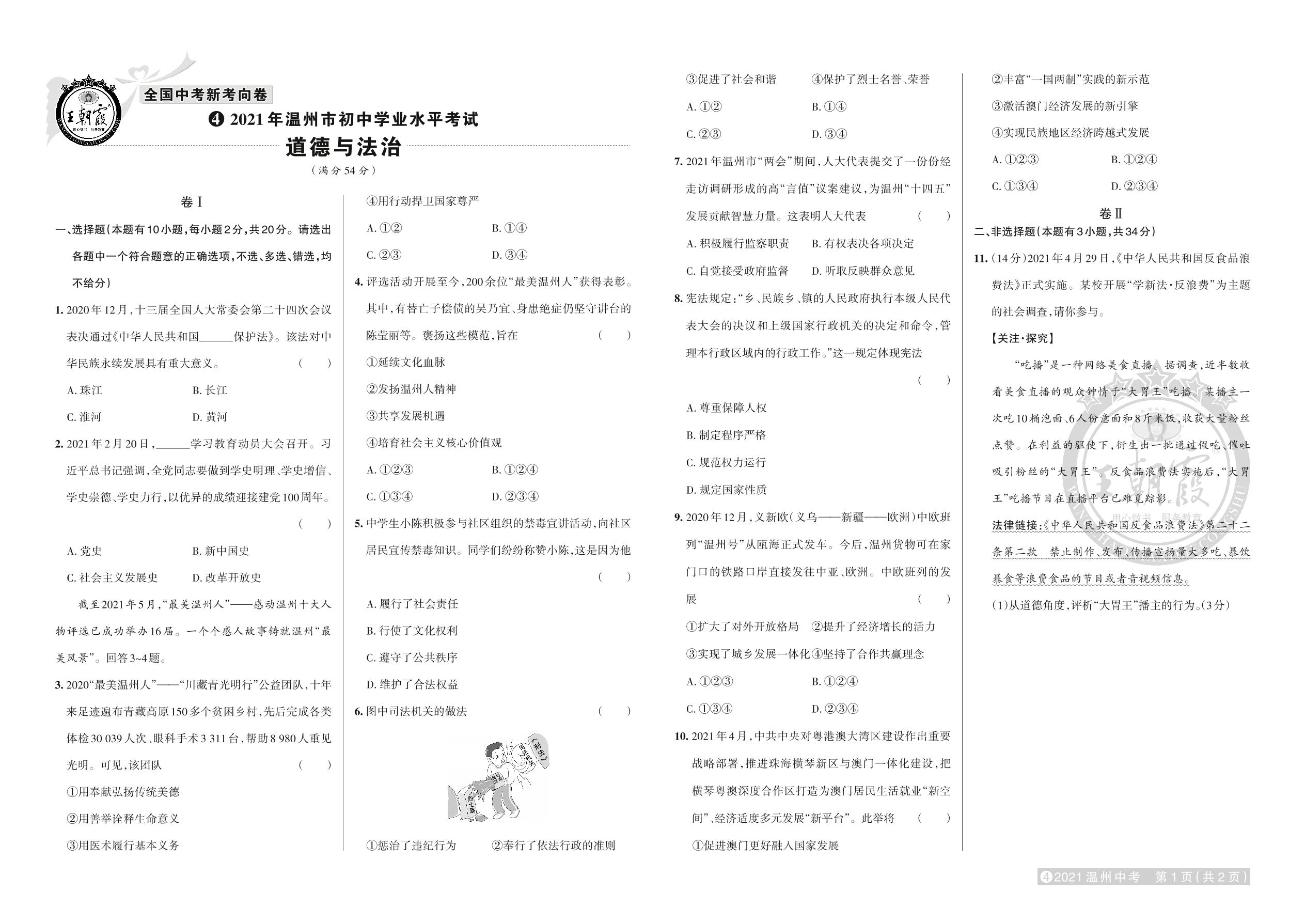试卷4 2021年温州市中考真题·道德与法治