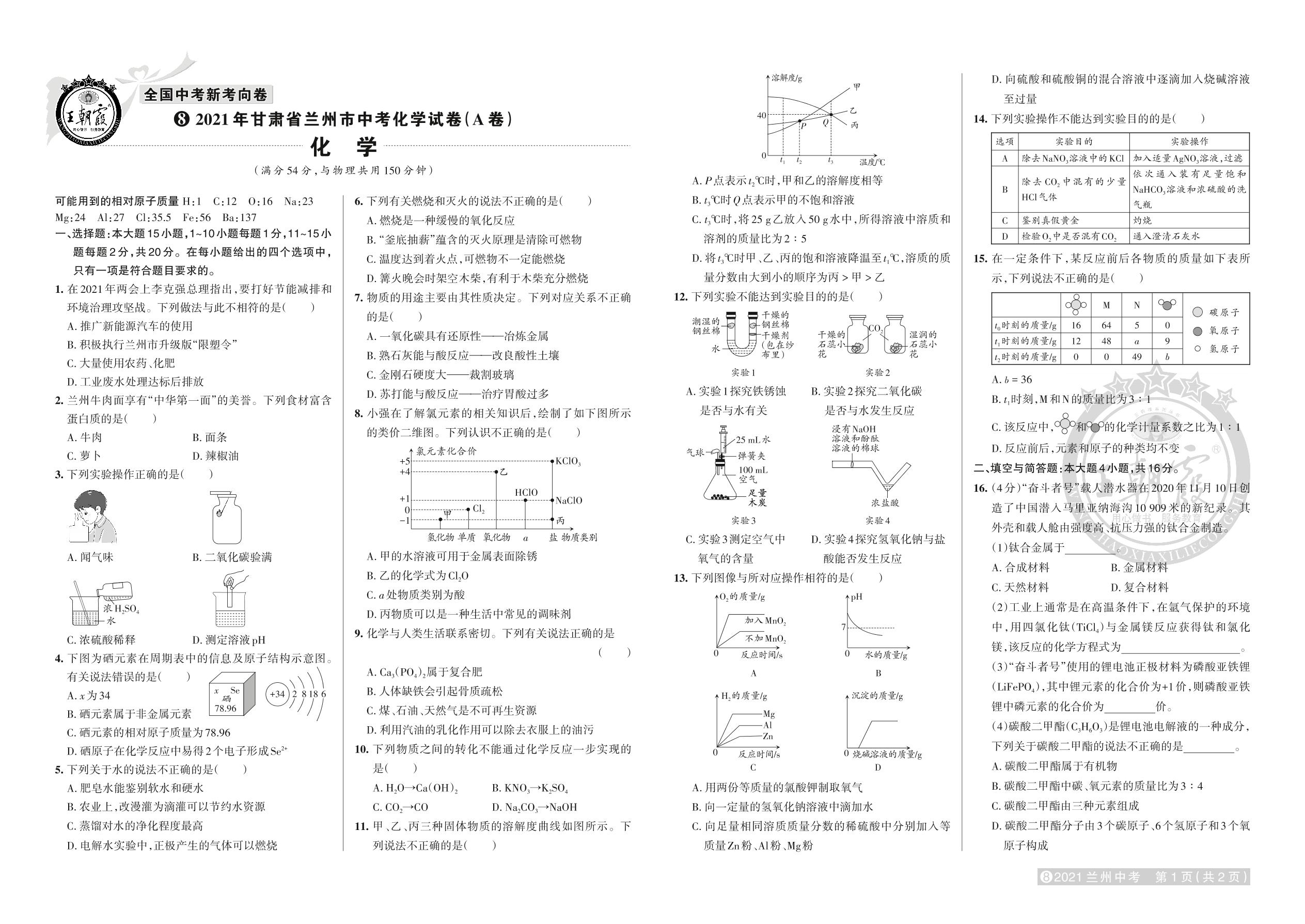 试卷8 2021年兰州市中考真题·化学