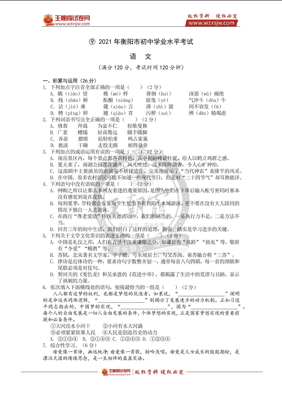 试卷9 2021年衡阳市中考真题·语文