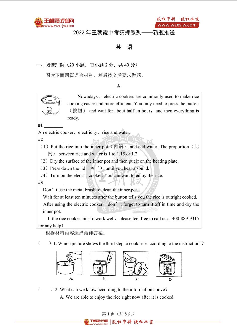 【英语】2022年王朝霞中考猜押系列——新题推送