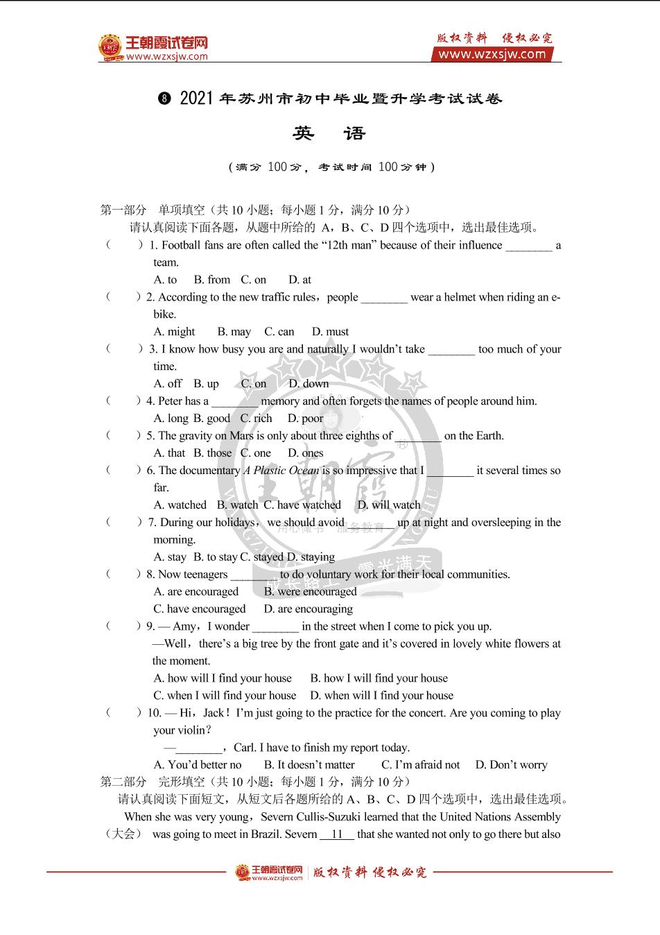 试卷8 2021年苏州市中考真题·英语