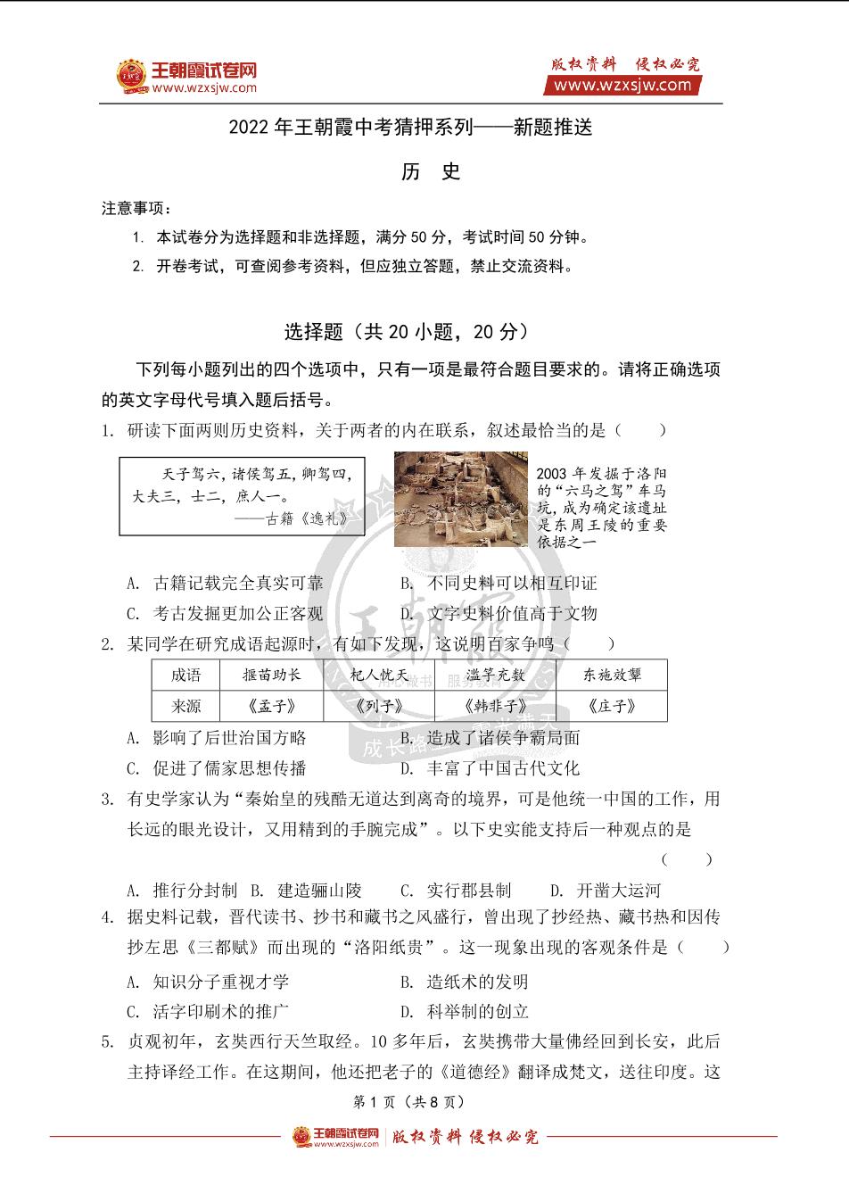 【历史】2022年王朝霞中考猜押系列——新题推送