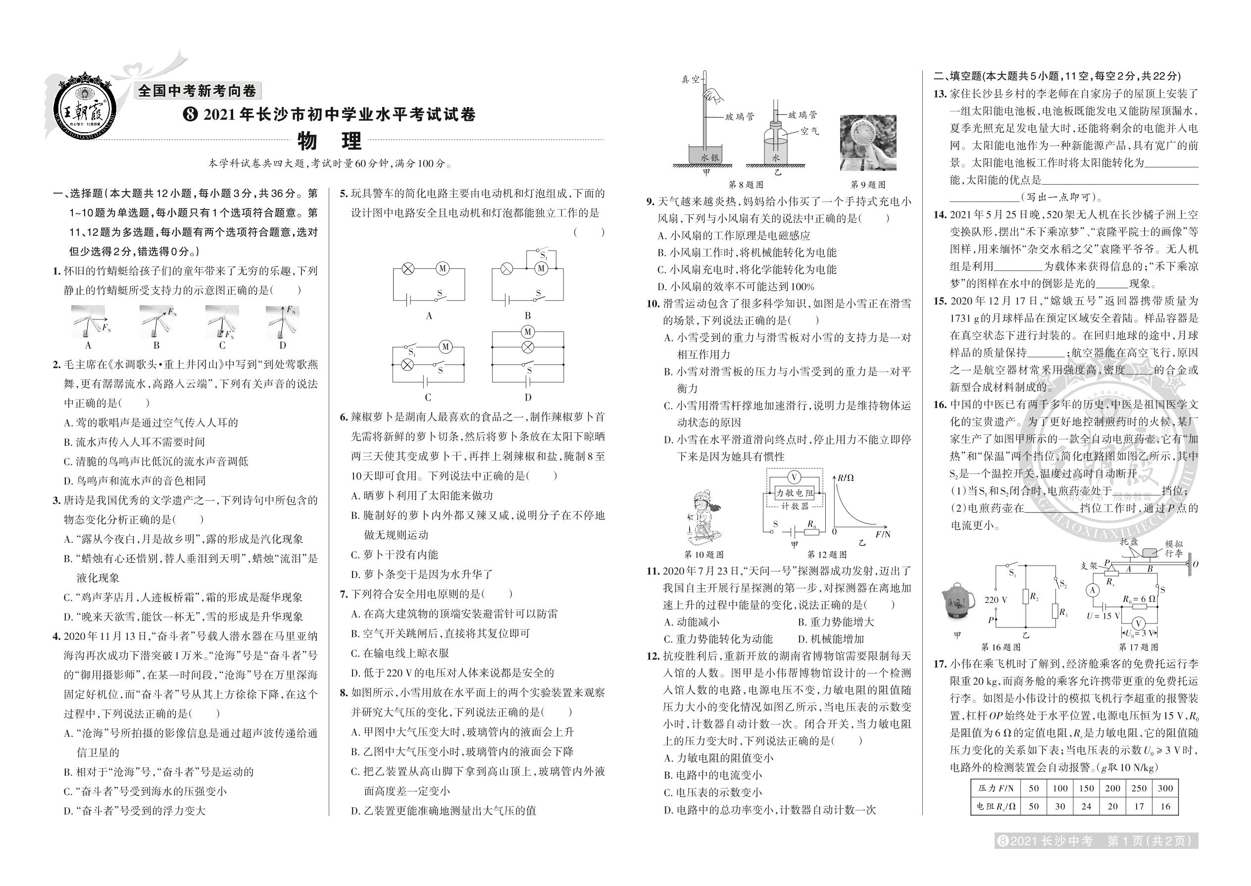 试卷8 2021年长沙市中考真题·物理