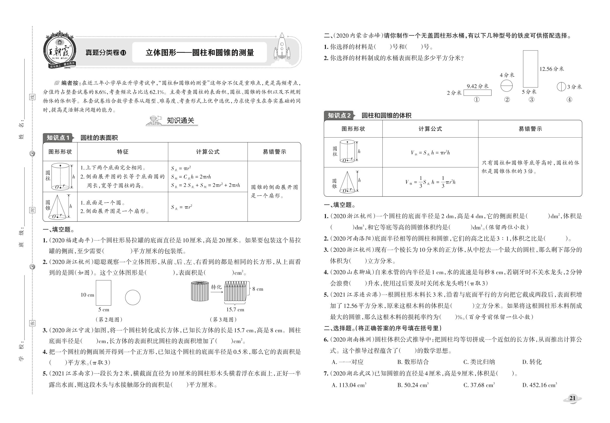 小升初数学真题分类·王朝霞精编卷——立体图形——圆柱和圆锥的测量【11】