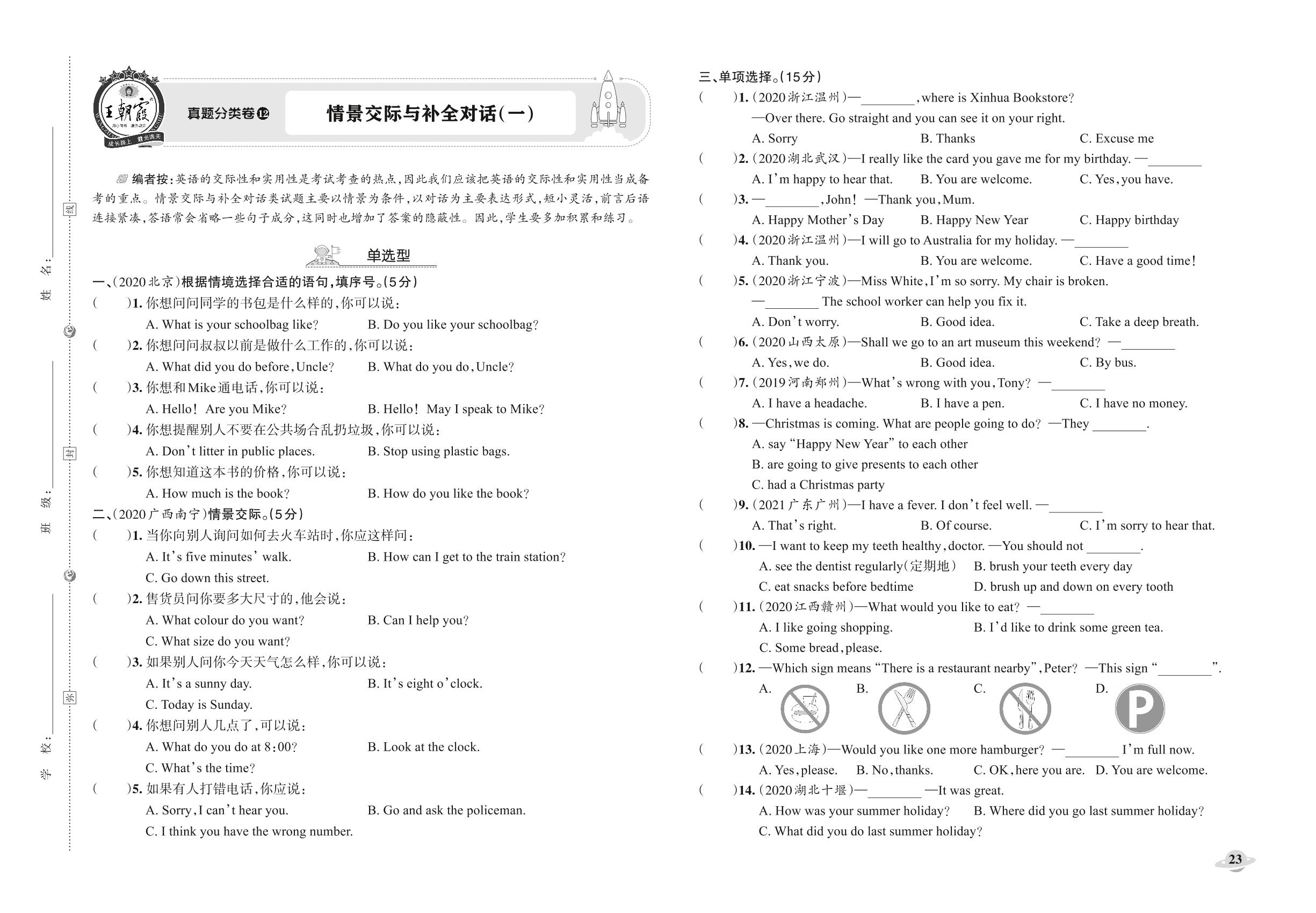 小升初英语真题分类·王朝霞精编卷——情景交际与补全对话(一)【12】