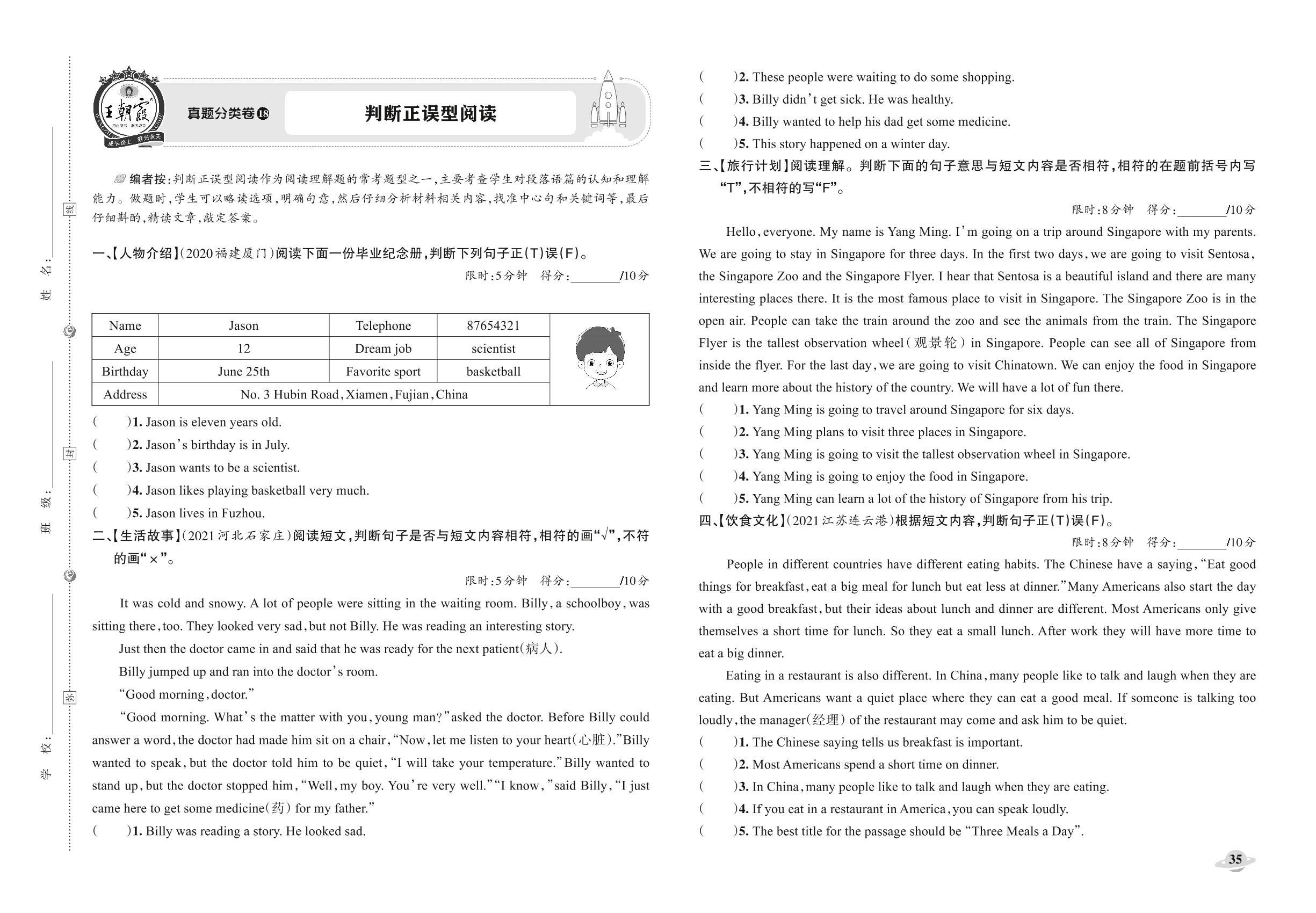 小升初英语真题分类·王朝霞精编卷——判断正误型阅读【18】