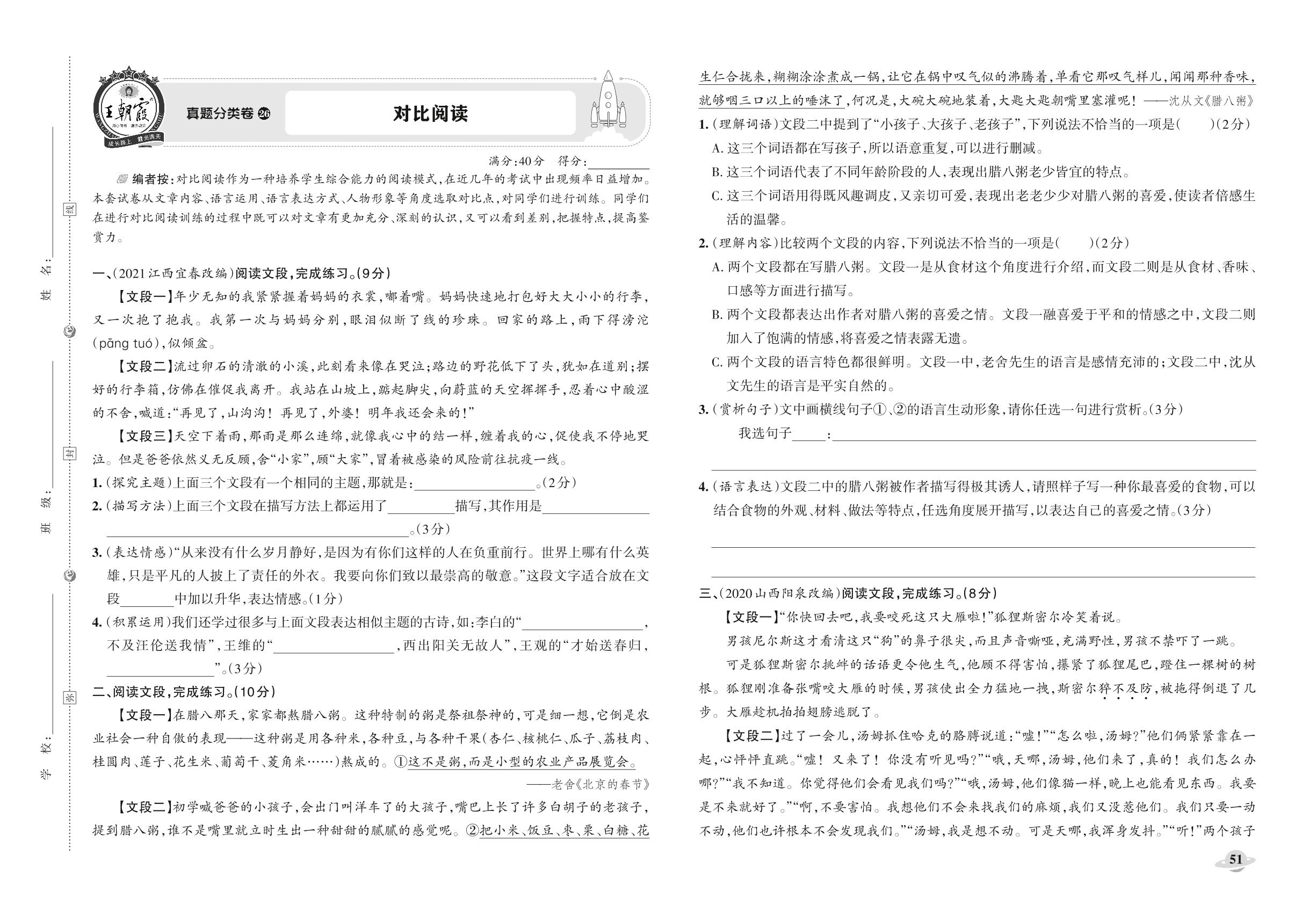 小升初语文真题分类·王朝霞精编卷——对比阅读【26】
