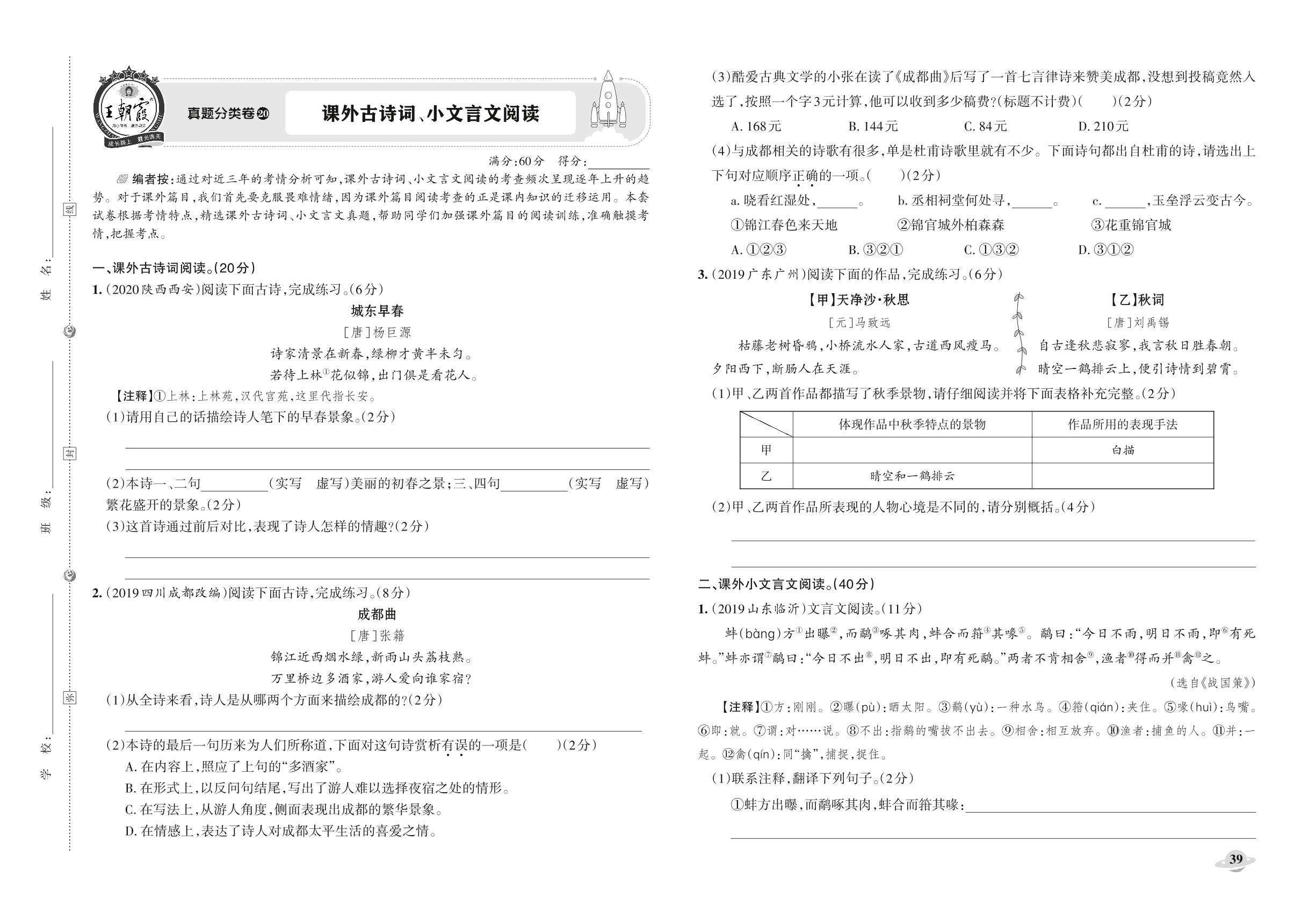 小升初语文真题分类·王朝霞精编卷——课外古诗词、小文言文阅读【20】