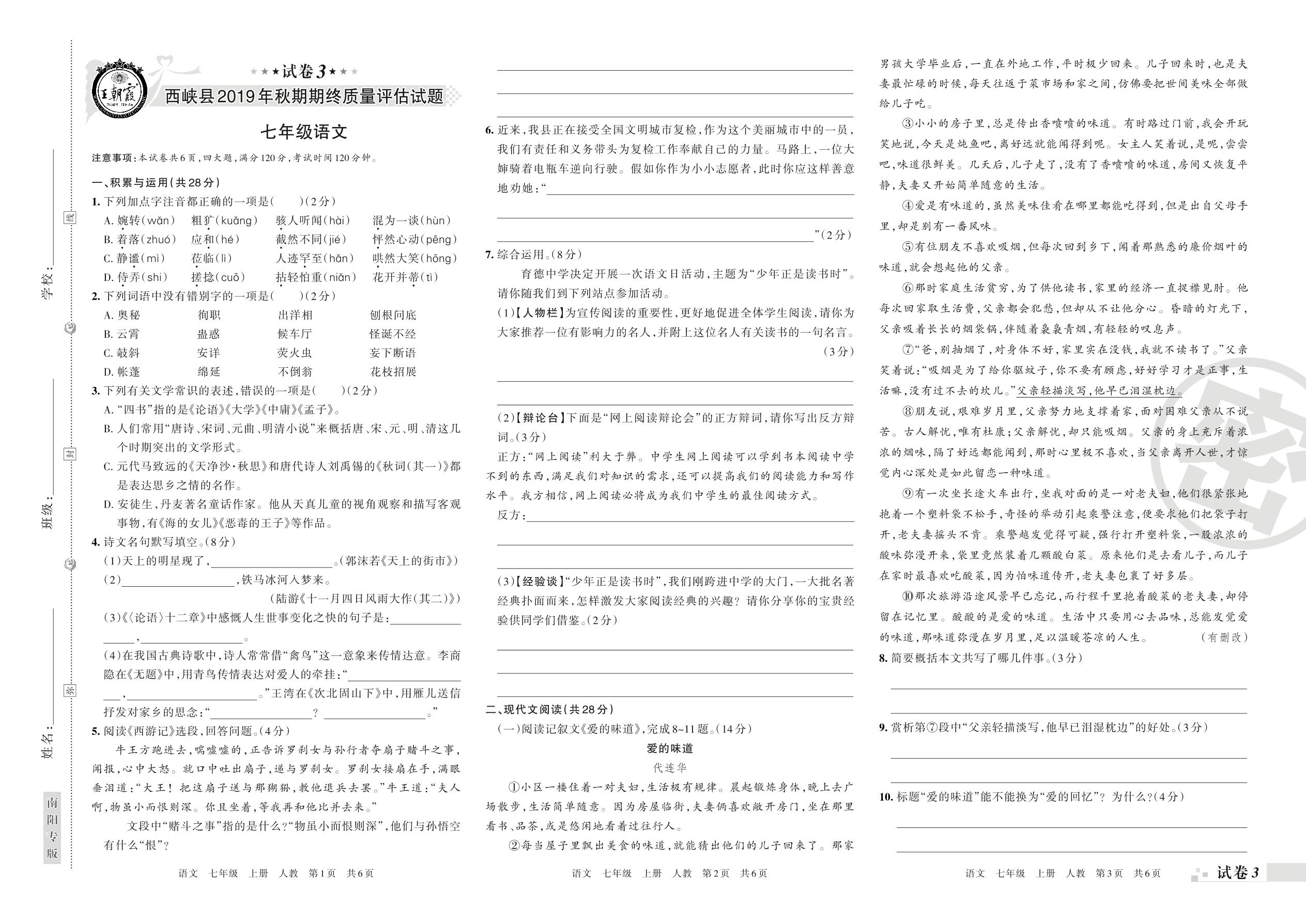 2019-2020学年第一学期南阳市西峡县七年级语文试卷(人教版)【3】