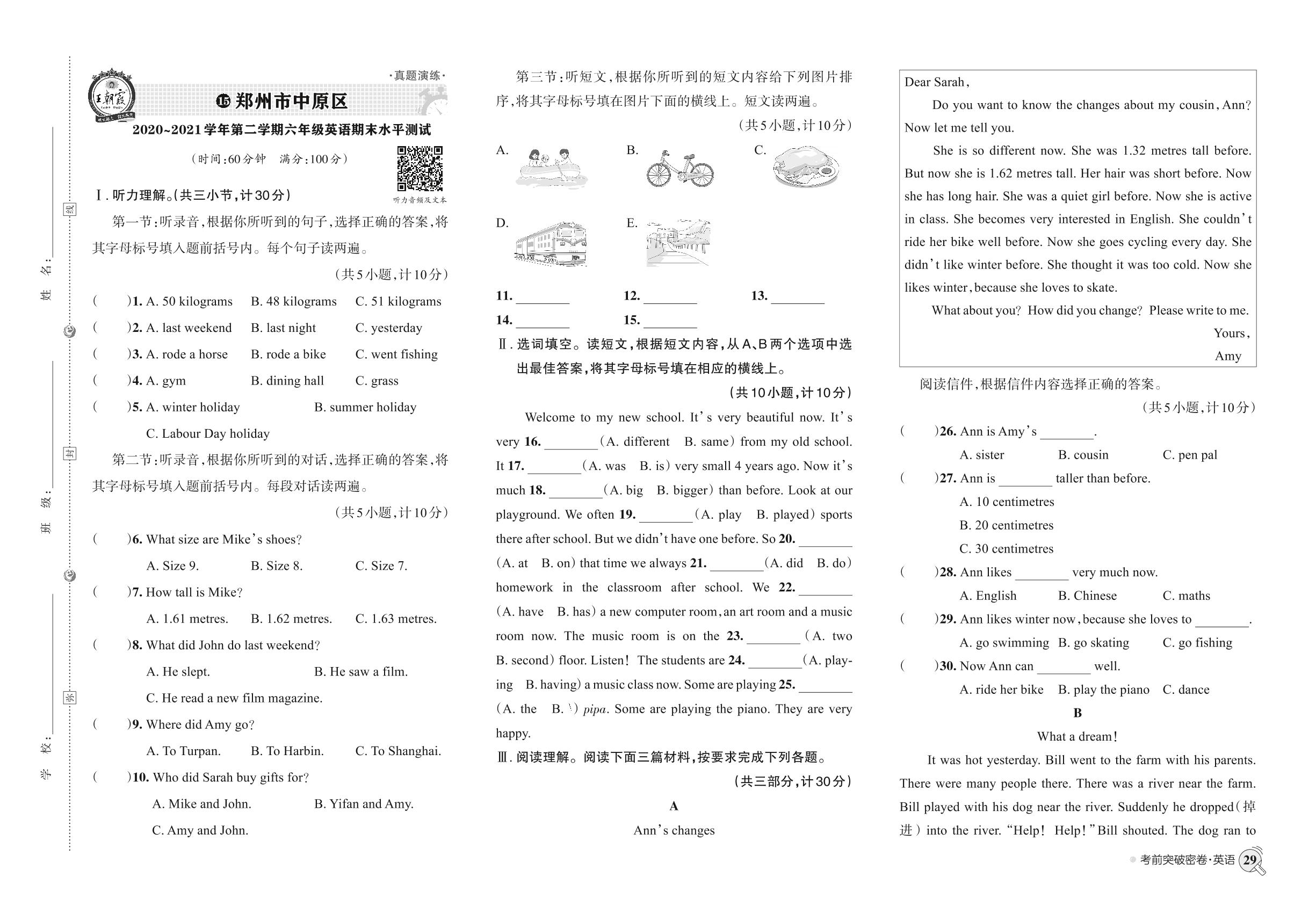 小升初英语郑州市中原区2020~2021学年第二学期六年级英语期末水平测试【15】