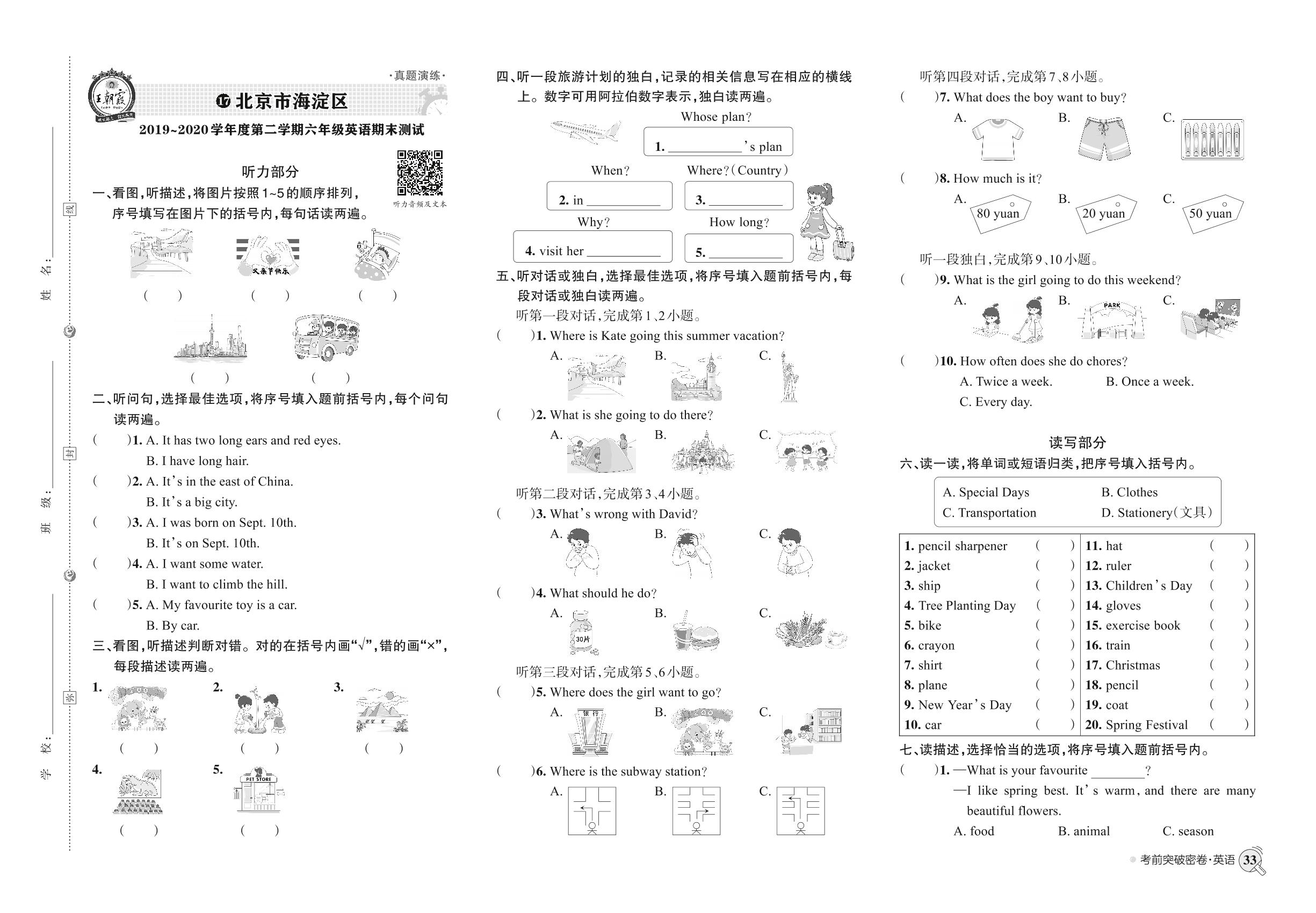小升初英语北京市海淀区2019~2020学年度第二学期六年级英语期末测试_R220316144817305【17】