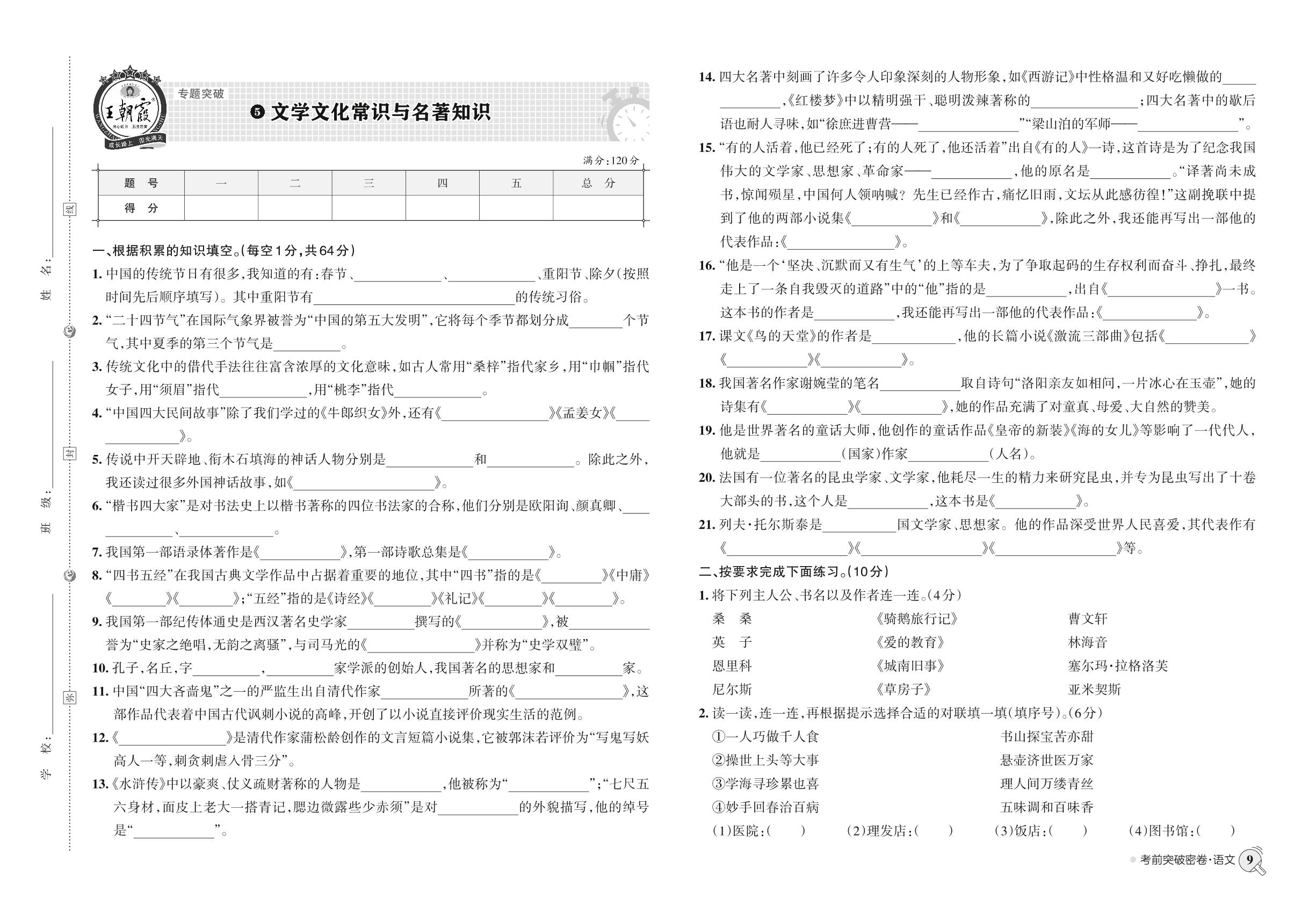 小升初语文·王朝霞专题归类突破密卷——文学文化常识与名著知识【5】