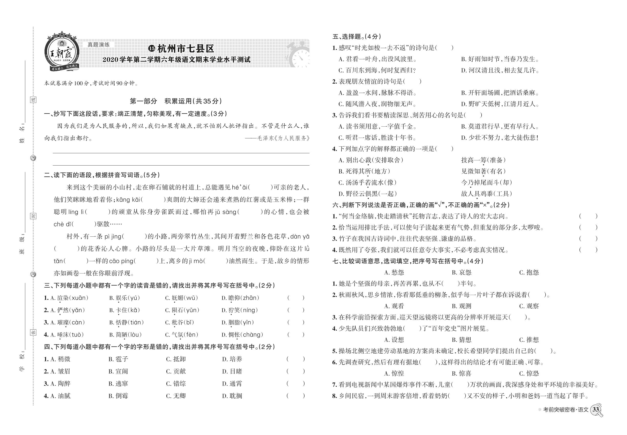 小升初语文杭州市七县区2020学年第二学期六年级语文期末学业水平测试【15】