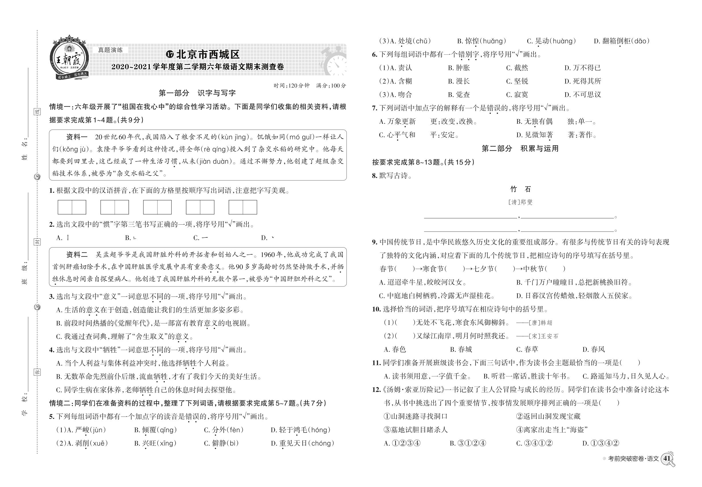 小升初语文北京市西城区2020~2021学年度第二学期六年级语文期末测查卷【17】