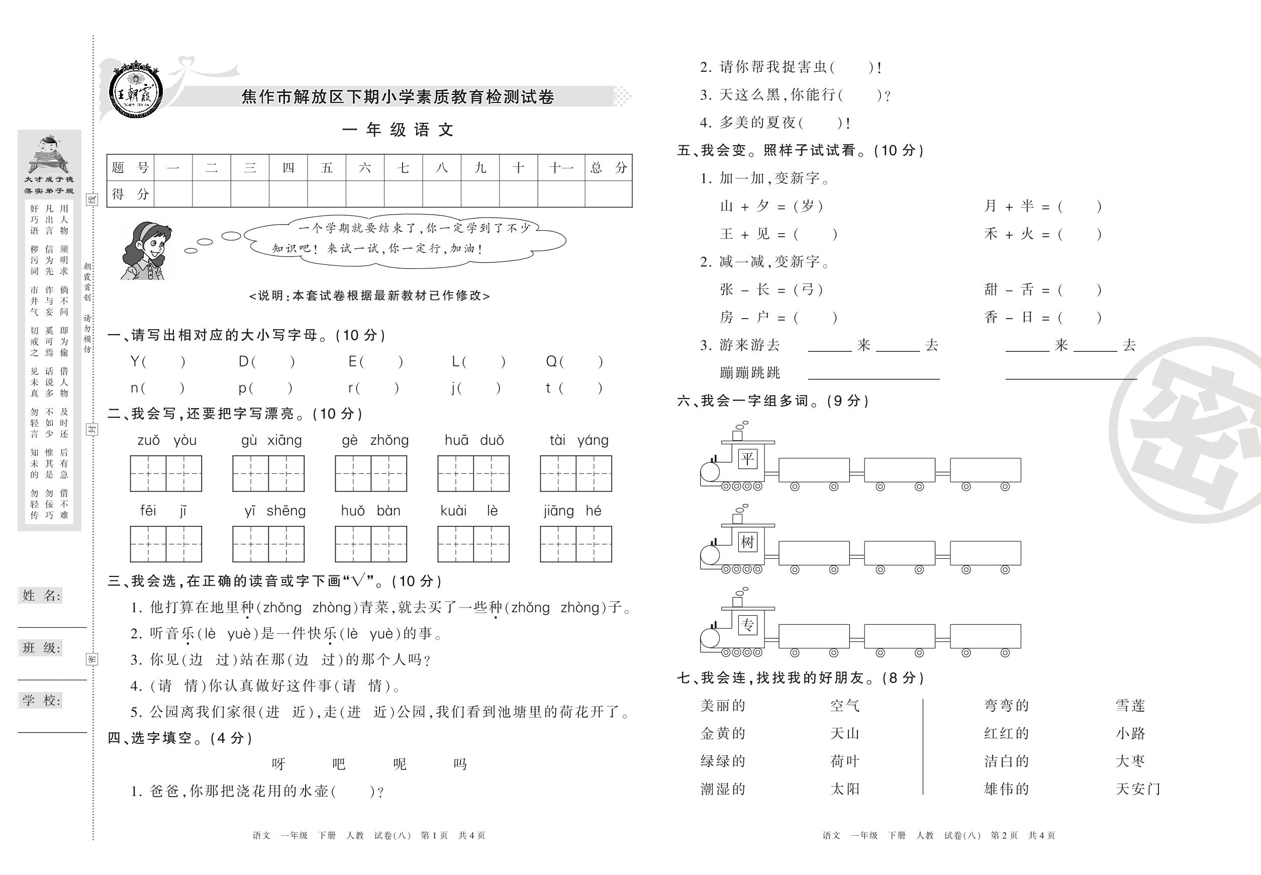 一年级语文人教版下册期末卷