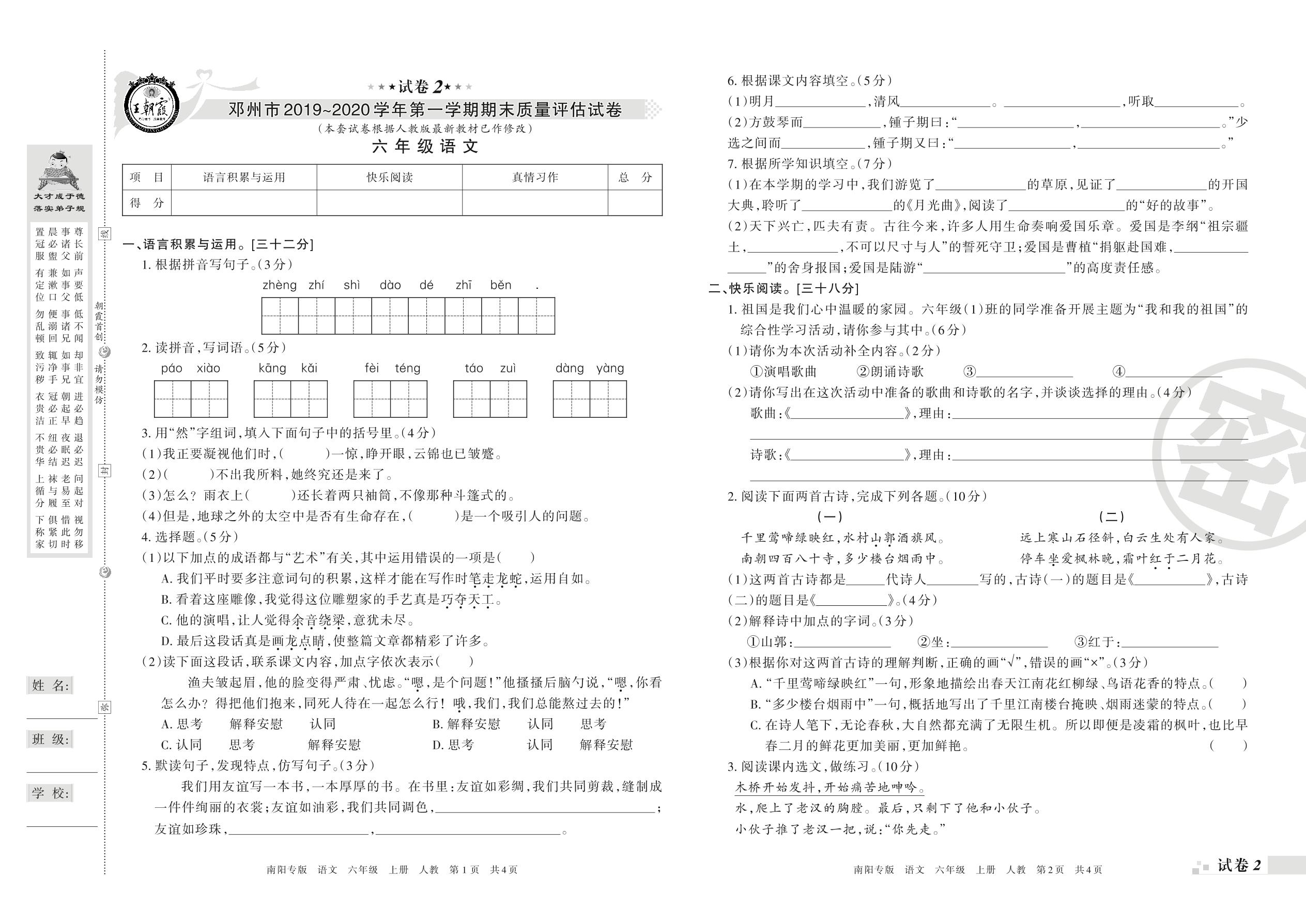 2019-2020学年第一学期邓州市六年级语文试卷(人教版)【2】