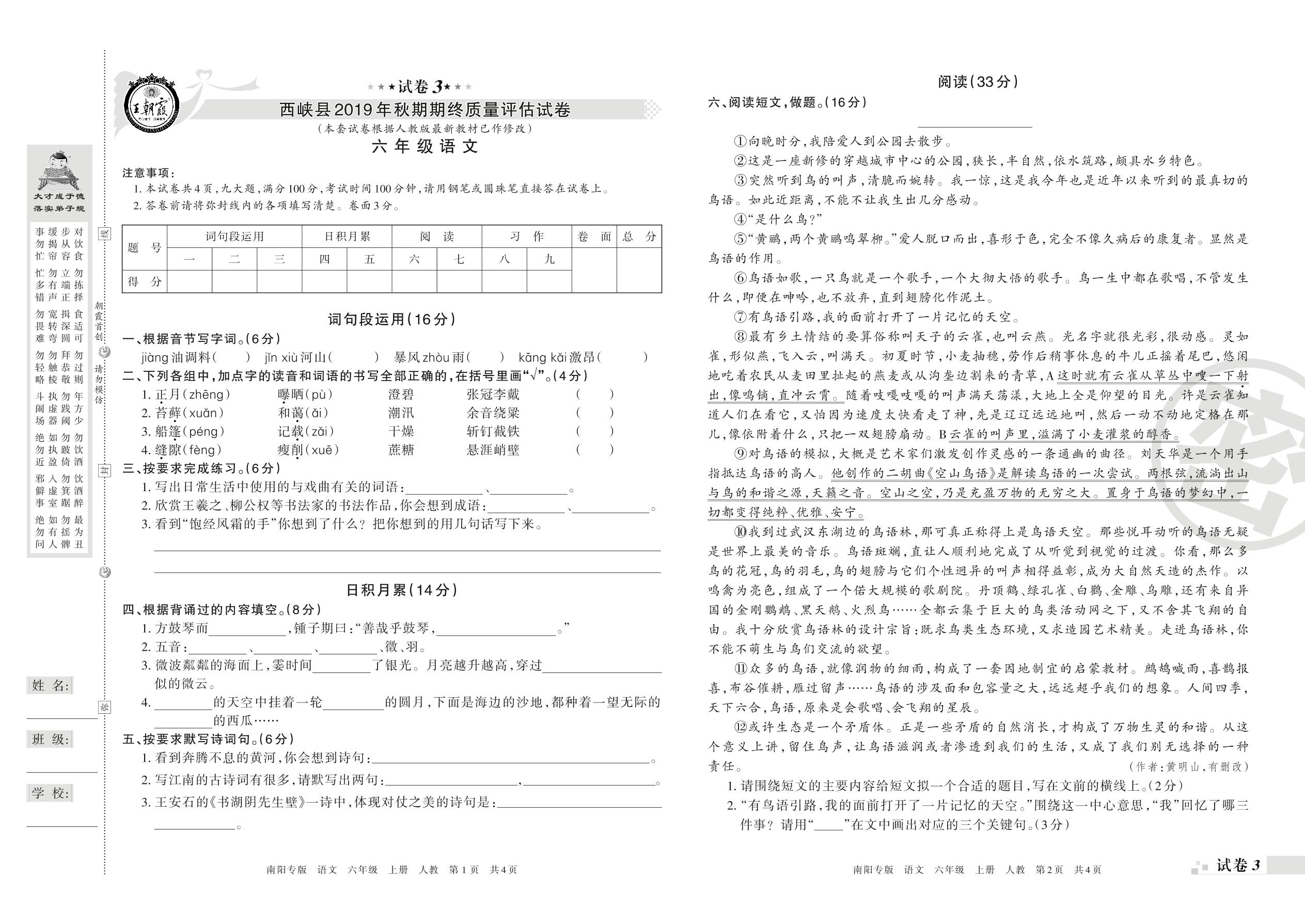 2019-2020学年第一学期南阳市西峡县六年级语文试卷(人教版)【3】