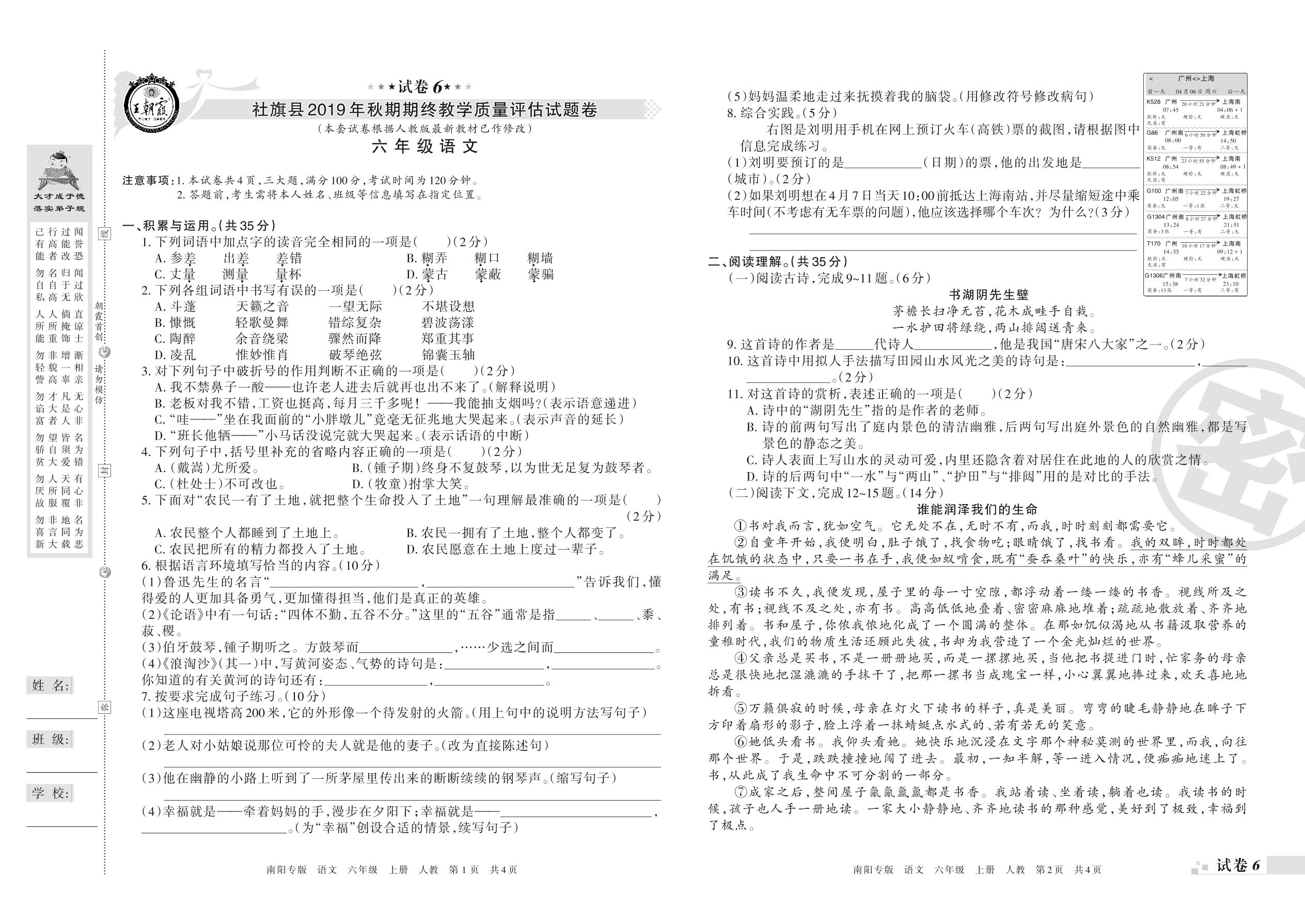 2019-2020学年第一学期南阳市社旗县六年级语文试卷(人教版)【6】
