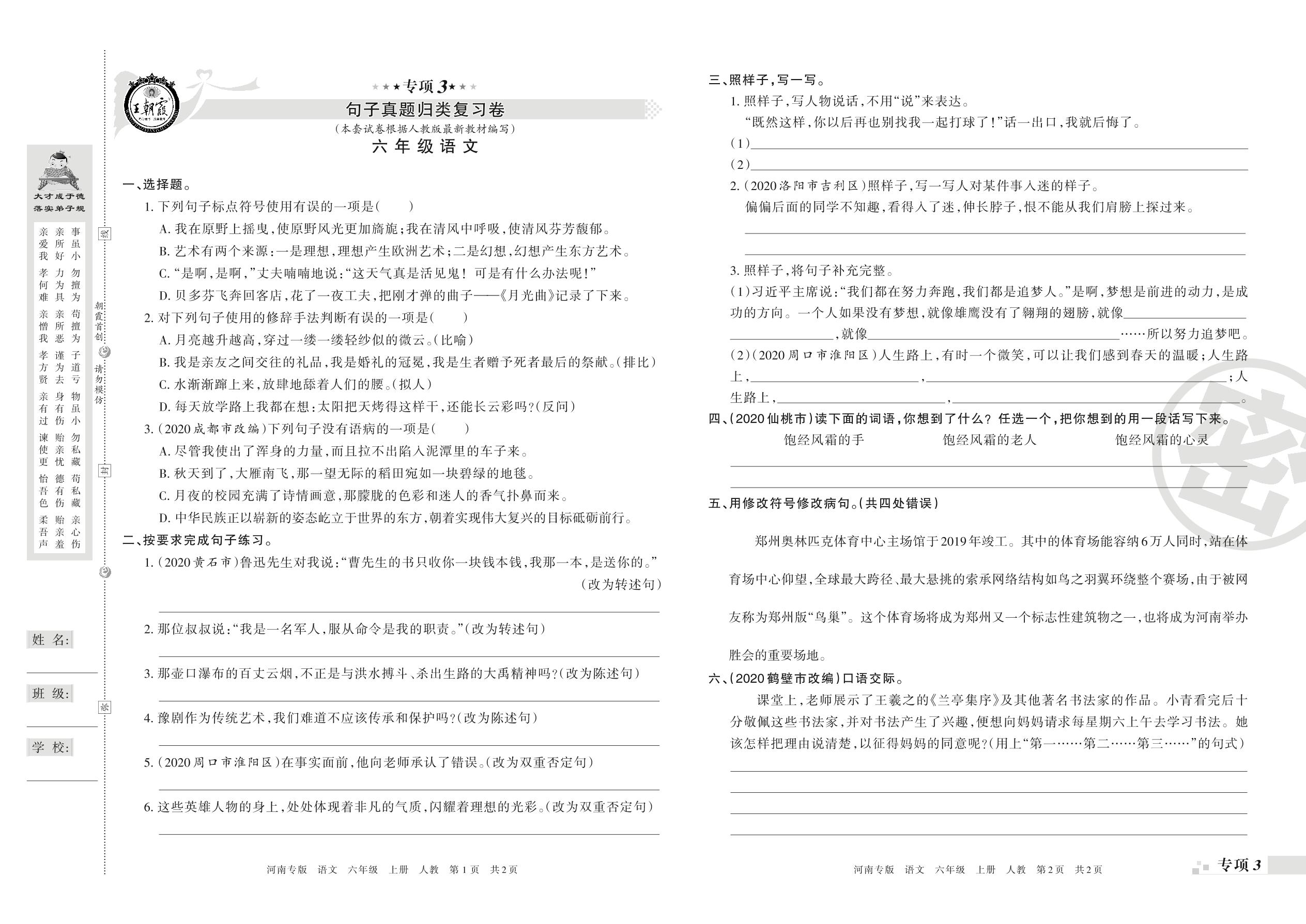 王朝霞期末专项卷——句子、课文内容与积累运用真题归类复习六年级上册语文(人教版)_R2108025904【0】