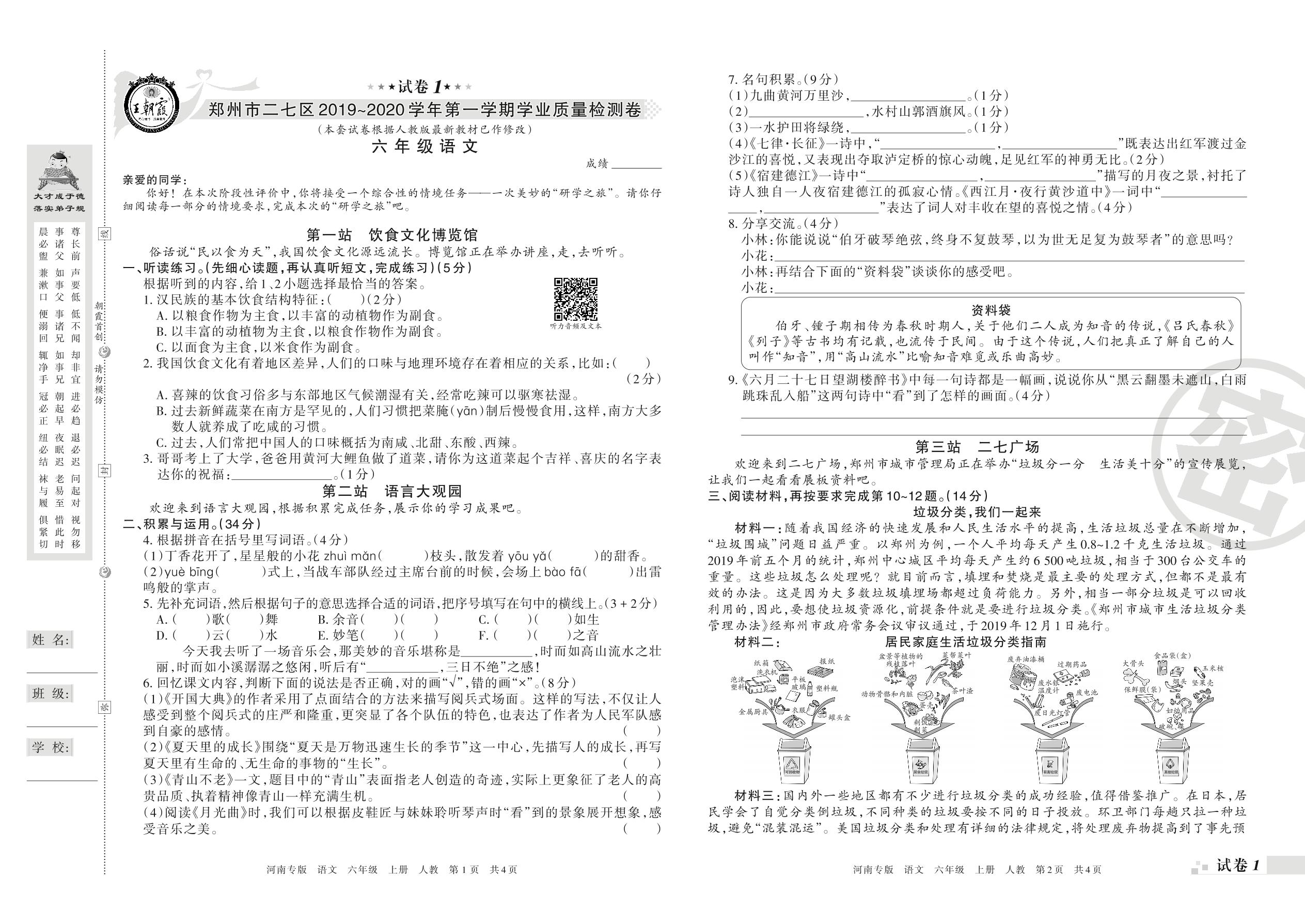 2019-2020学年第一学期郑州市二七区六年级语文试卷(人教版)【1】