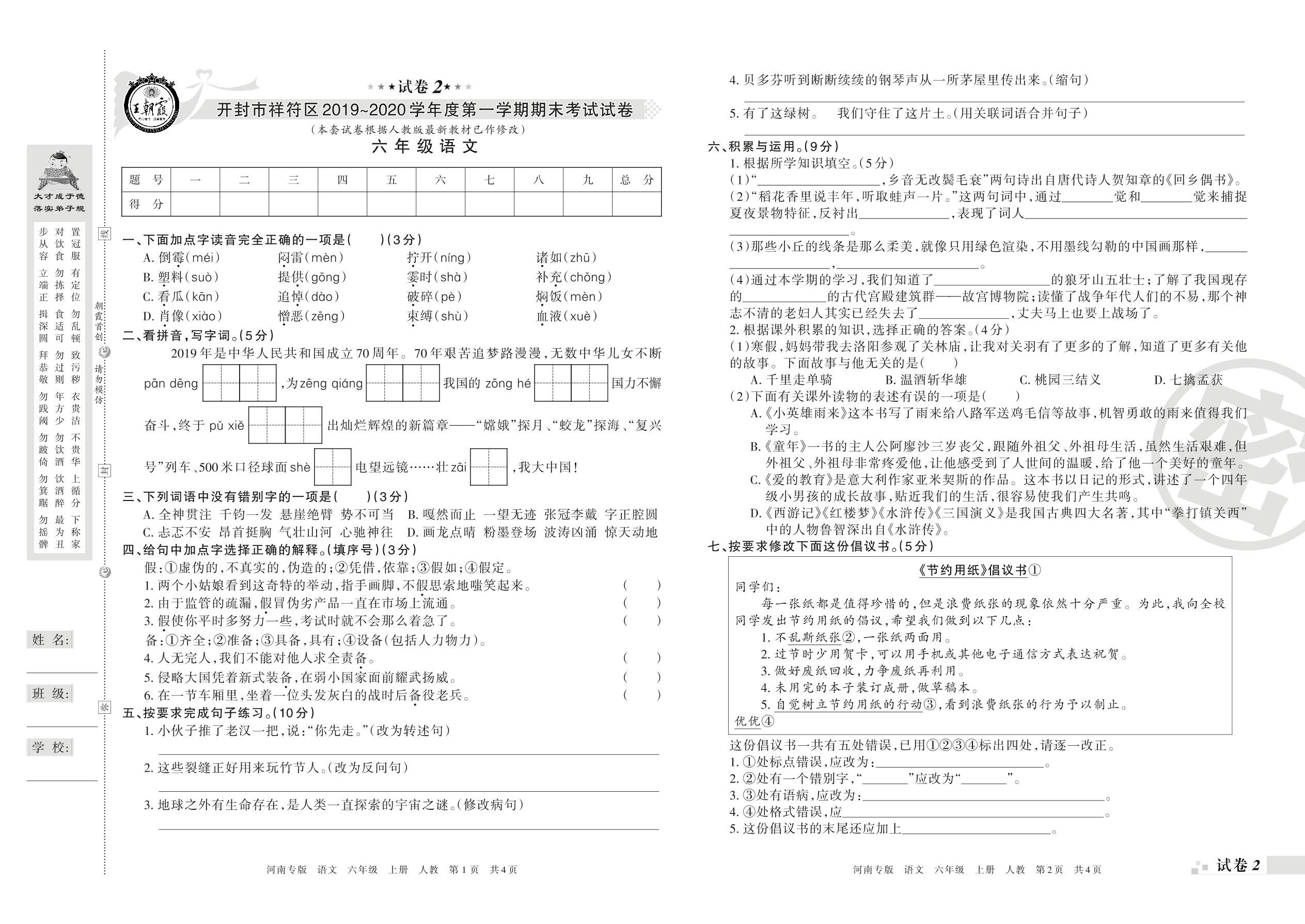 2019-2020学年第一学期开封市祥符区六年级语文试卷(人教版)【2】