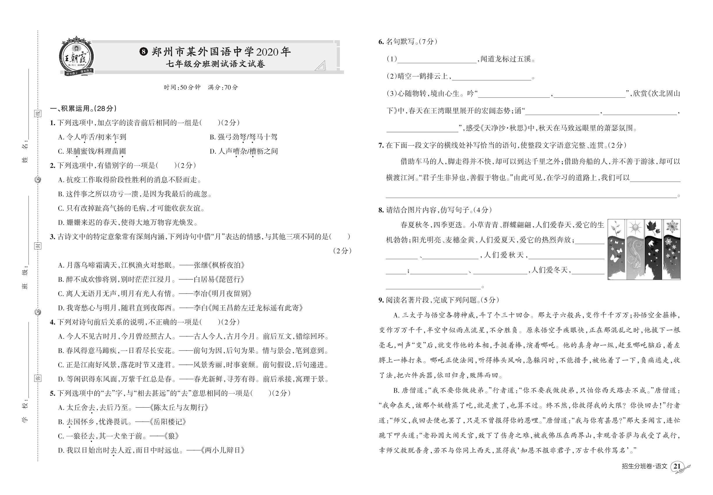 小升初语文郑州市某外国语中学2020年七年级分班测试语文试卷【8】